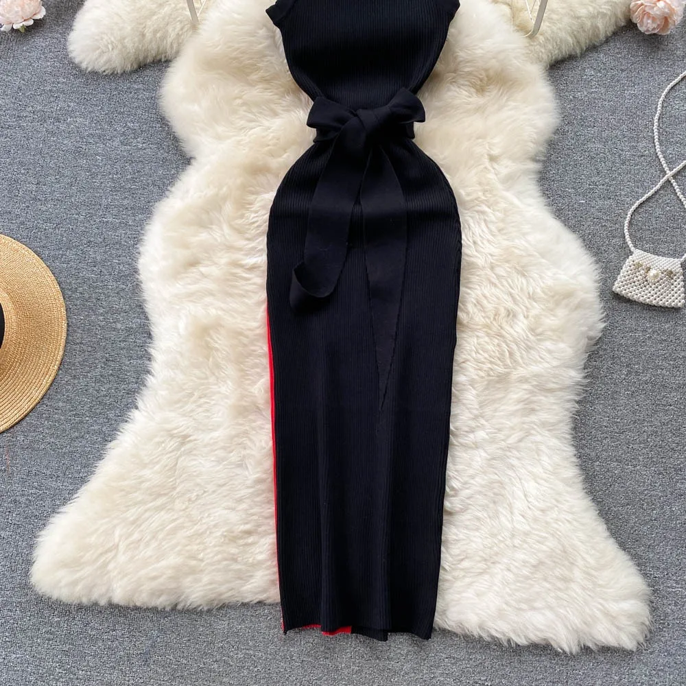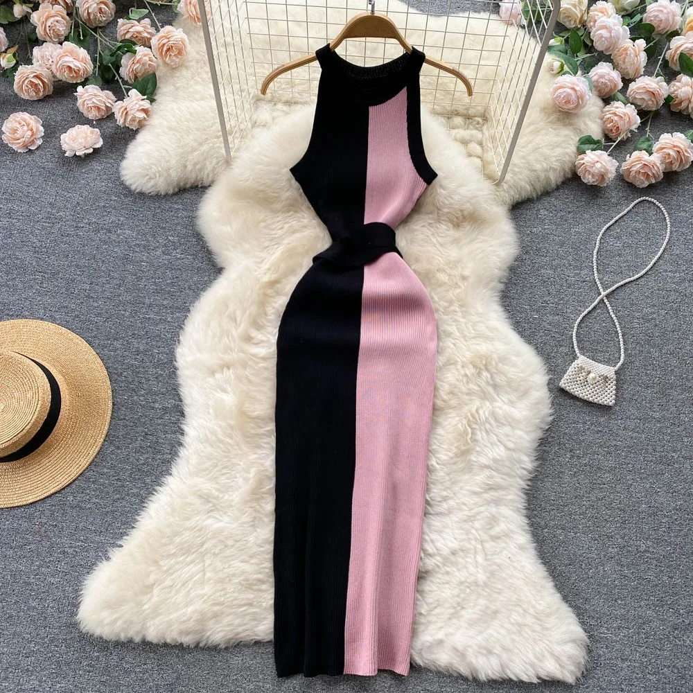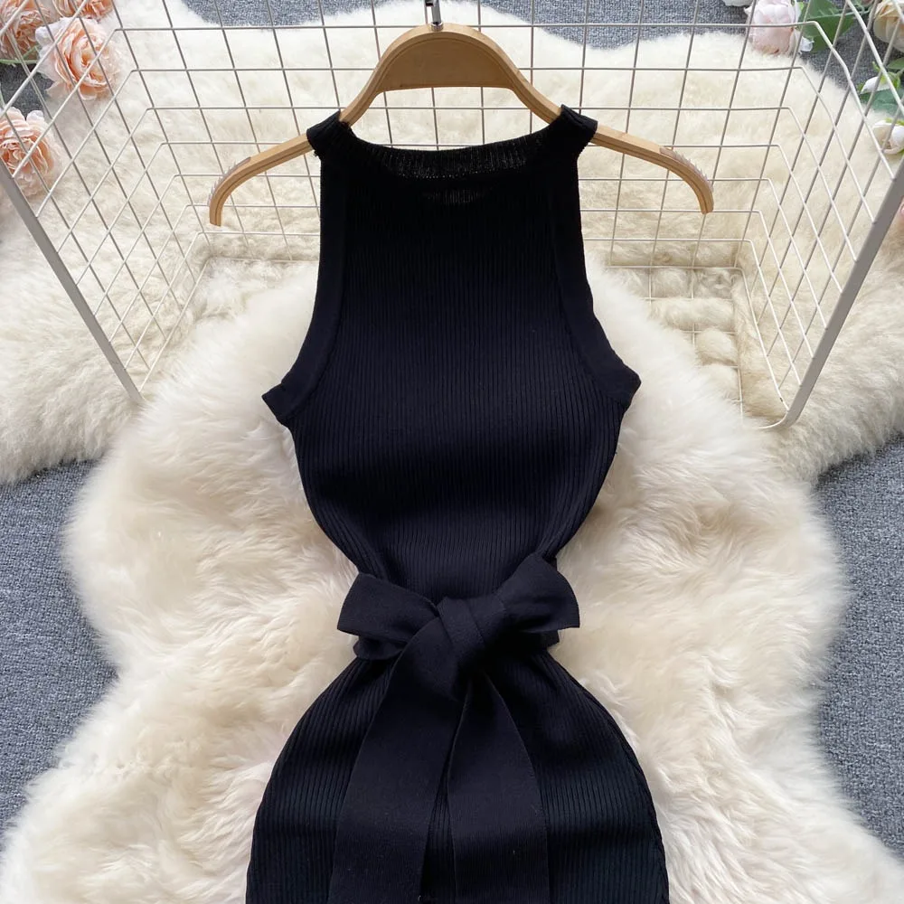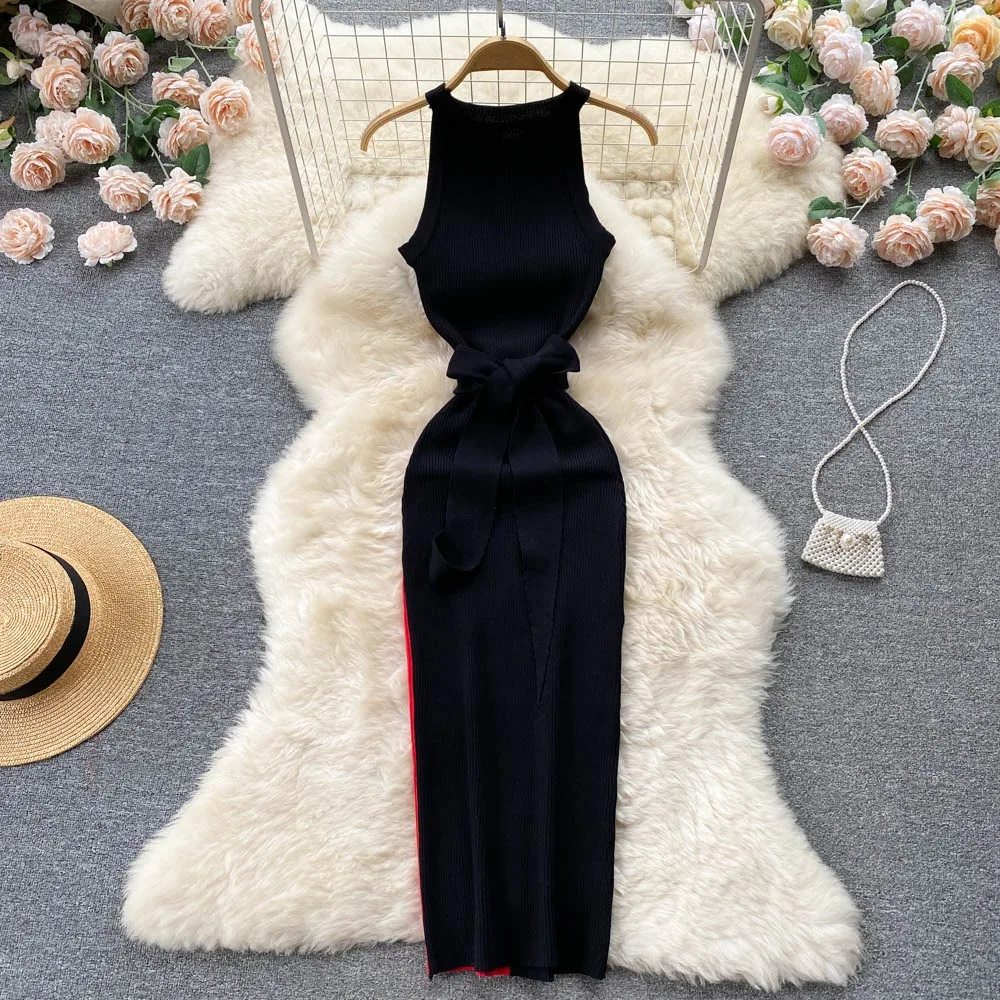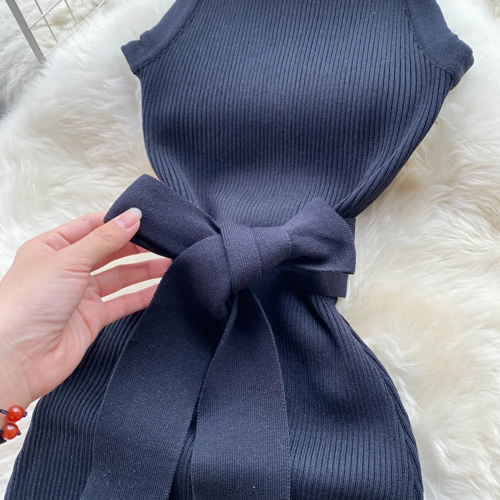 New York’s Fashion Women Dress 2025 Summer Elegant Rib Knit Slim Waist Bandage Pencil Dress Office Lady Sleeveless Bodycon Sweater Dress