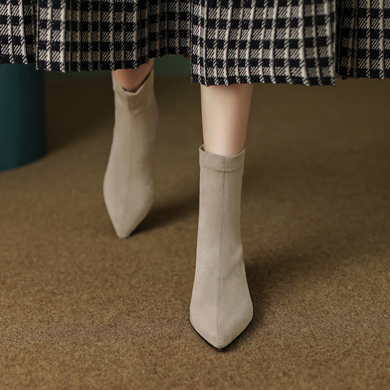 New York’s Fashion Women’s Elastic Boots 2025 Autumn/winter New Pointed Suede Nude Color Non-slip Back Zipper High-heeled Fashion Boots Botas Mujer