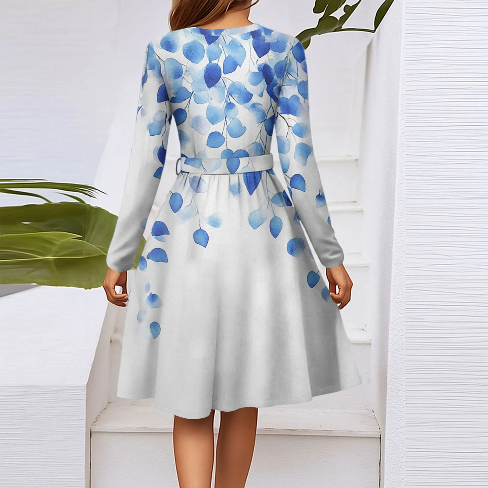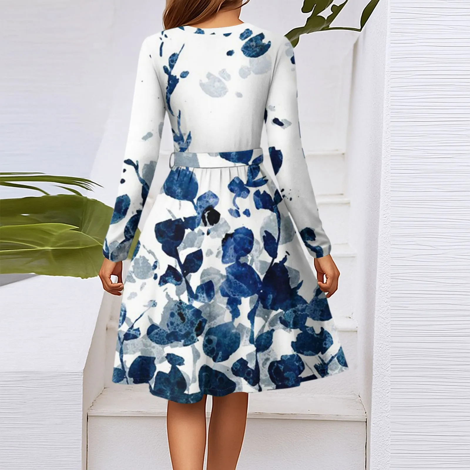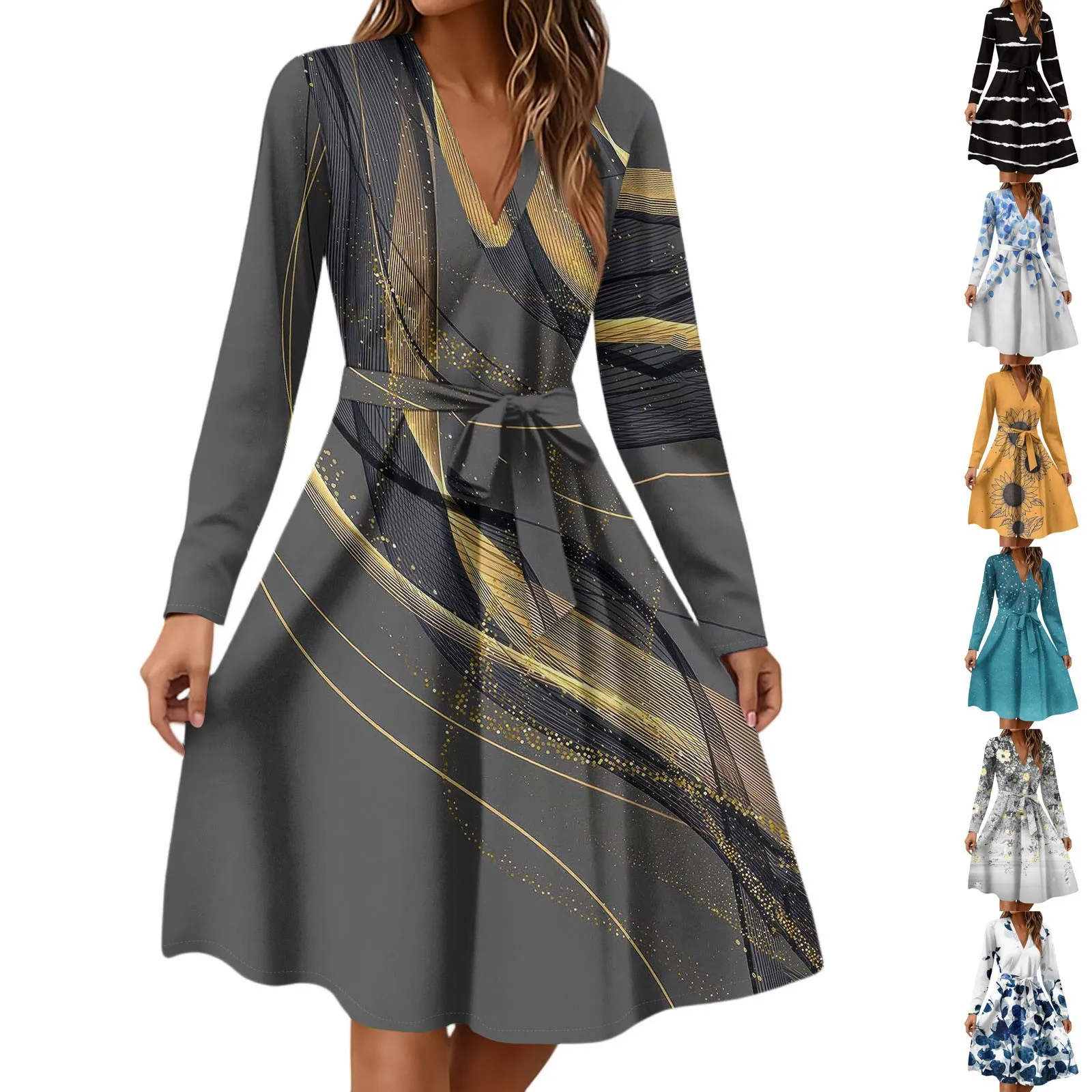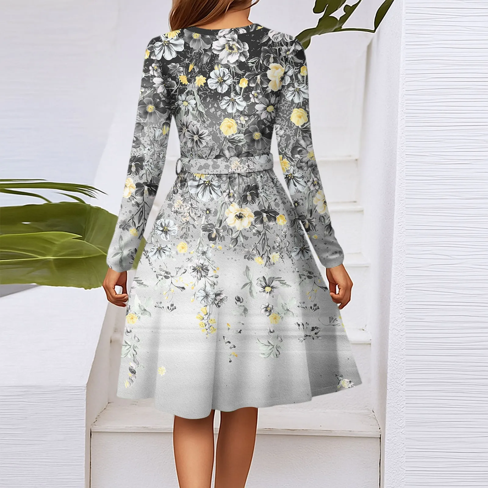 New York’s Fashion Women’S Fashion Casual V-Neck Long Sleeve Waist Floral Print Midi Dress Vestidos Para Mujer Female Dress Y2k Traf Roupas Feminin