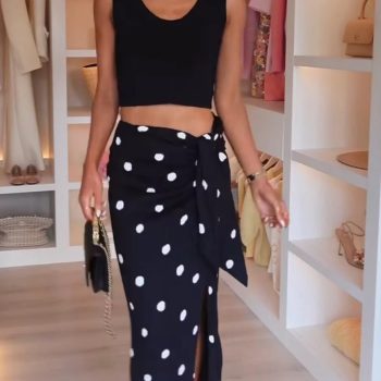 New York’s Fashion 2025 Sexy Black Polka Dot Midi Skirt: Thigh-High Slit, Bow-Tie Waist, Ankle-Length Curve-Hugging Design For Woman Summer Casual