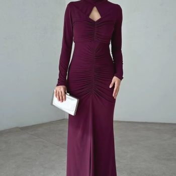 New York’s Fashion Hollow Out Long Sleeve Sexy Maxi Dress For Women Fashion Turtleneck Ruched Bodycon Club Party Elegant Long Dress