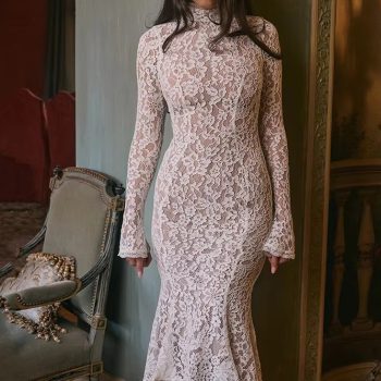 New York’s Fashion Lace Long Sleeve Sexy Midi Dress For Women Elegant White Half High Collar High Waist Bodycon Club Party Sexy Long Dress