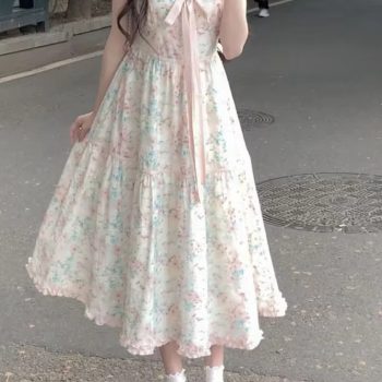 New York’s Fashion 2024 Summer New Japanese Kawaii Y2k Midi Dress Women Casual Sweet Bow Splicing Flower Print Dress Korean Fashion Evening Party