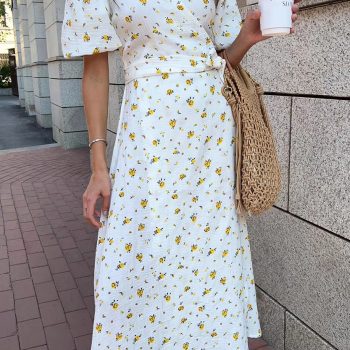 New York’s Fashion Casual Women’s Summer Dresses 100% Cotton Floral Print A-line Midi Dress with Side Slits Long Elegant White Dress for Women 2024