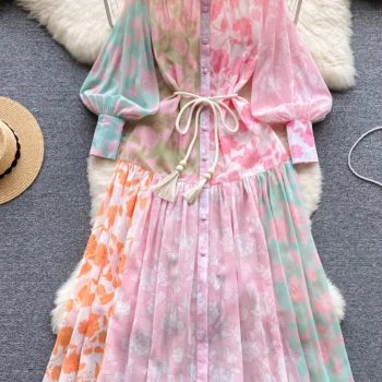 New York’s Fashion Chic Print Pleated Elegant Lantern Sleeve Dress A-line Casual Lace Up Vacation Party Dress Women Fashion Autumn Spring Vestidos