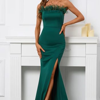 New York’s Fashion 2024 Off Shoulder Feather Long Sexy Slit Satin Dress Floor Length Green Color Evening Party Maxi Celebrity Dress