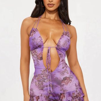 New York’s Fashion 2024 Print Halter Deep V Neck Backless Bandage Sexy Slim Pleated Mini Dress Summer Women Casual Clothes Party Vacation