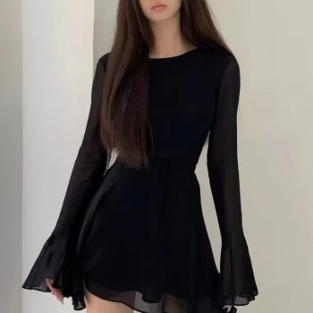New York’s Fashion Backless Black Dress Women Elegant Back Hollow Out Lace-up Long Sleeve Mesh Patchwork Sexy Slim Ruffle Mini Dress Party