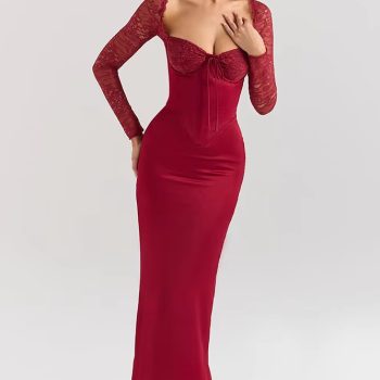New York’s Fashion Backless Long Sleeve Sexy Maxi Dress For Women Solid Square Collar Lace-up Back Split Bodycon Club Long Dress Elegant