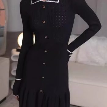 New York’s Fashion Autumn Long Sleeve Knit Dress For Women Fashion Lapel Single-btrasted Button High Waist Ruffled Mini Dress Knitwear