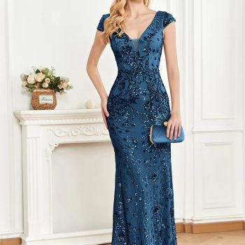 New York’s Fashion Blue Sequin Backless Sexy Slit Long Party Evening Dresses Luxury V Neck Velvet Stretch Sleeveless Cocktail Prom Dress