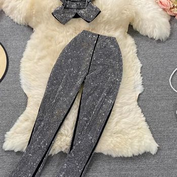 New York’s Fashion Sexy Women Black/White Diamonds Two Piece Set Party Slash Neck Off Shoulder Camis Tops + High Waist Pants Female Suit Autumn New