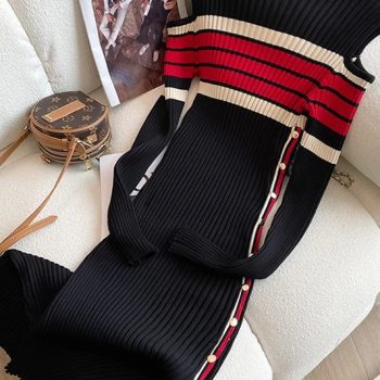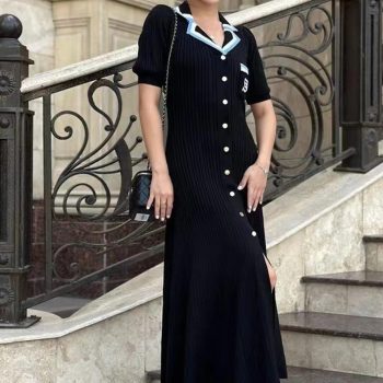 New York’s Fashion 2024 Elegant Slim Knitted Long Dress Women’s Letter Single Breasted Long Sleeved Designer Vintage Dresses Autumn