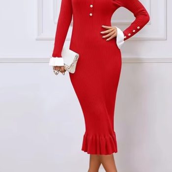 New York’s Fashion Chic Fashion Sexy Package Hips Ruffled Knitted Dress Women Slim Elastic Ribbed Long Sweater Dress Elegant Party Bodycon