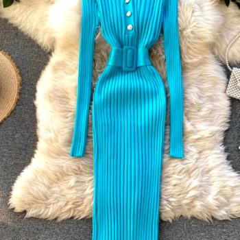 New York’s Fashion Elegant Lace Up Turtleneck Knitted Long Dress Korean Fashion Khaki Black Rib Bandage Bodycon Sweater Dress Robe Femme