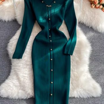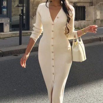 New York’s Fashion Elegant Evening Dress Women V Neck Long Sleeve Patchwork Button Slit Sweater Dresses 2024 Autumn Winter Knit Maxi Dress