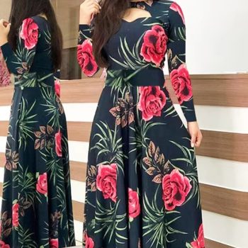 New York’s Fasion Spring /Autumn Fashion Flower Long Sleeved O-Neck Hollow Slim Fit Dress Women Elegant Long Vestido Maxi Clothes Robe Sexy Femme