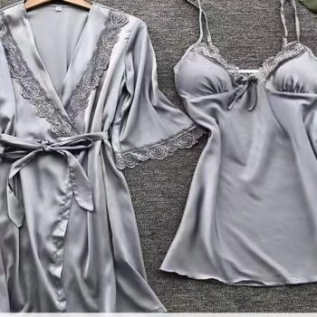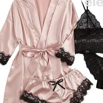 New York’s Fashion 4 Pieces Woman Sleepwear Pajamas Ser With Robe Sexy Lace Lingerie Bathrobe Silk Satin Home Clothed Nightwear Robe