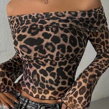 New York’s Fashion Leopard Print Long Sleeve T-shirt Women Off-shoulder Backless Crop Tops Female Fashion Printed Strapless Tees Tops