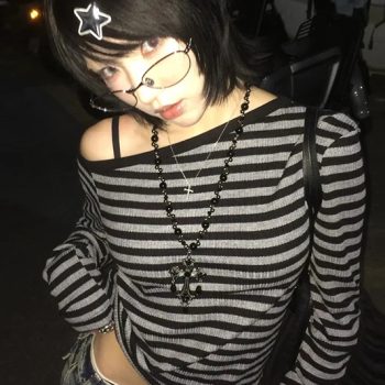 New York’s Fashion Japanese Y2k T-shirt Women Long Sleeve Off Shoulder Striped Crop Tops Y2k Grunge 2000s Aesthetic Streetwear T Shirts