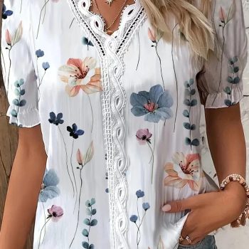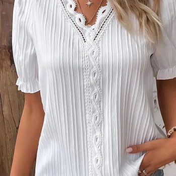 New York’s Fashion Plus Size Women’s Shirt Blouse Yellow-green Violets White Plain Lace Short Sleeve Casual Basic V Neck Regular Pullover White Blo