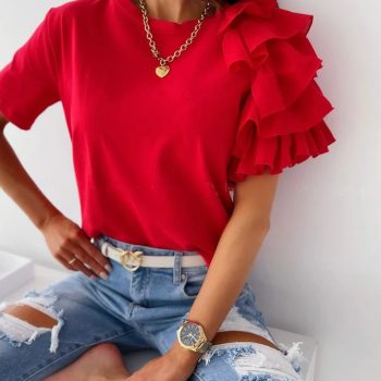 New York’s Fashion Women Summer Ruffles Short Sleeve Loose T Shirt Chic Elegant Solid O Neck Tops Casual Simple All Match Tee Streetwear Blouse