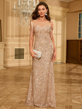 New York’s Fashion Cut-Out Tassel Sleeve Glitter Sequin Floor-Length Backless Formal Evening Dress