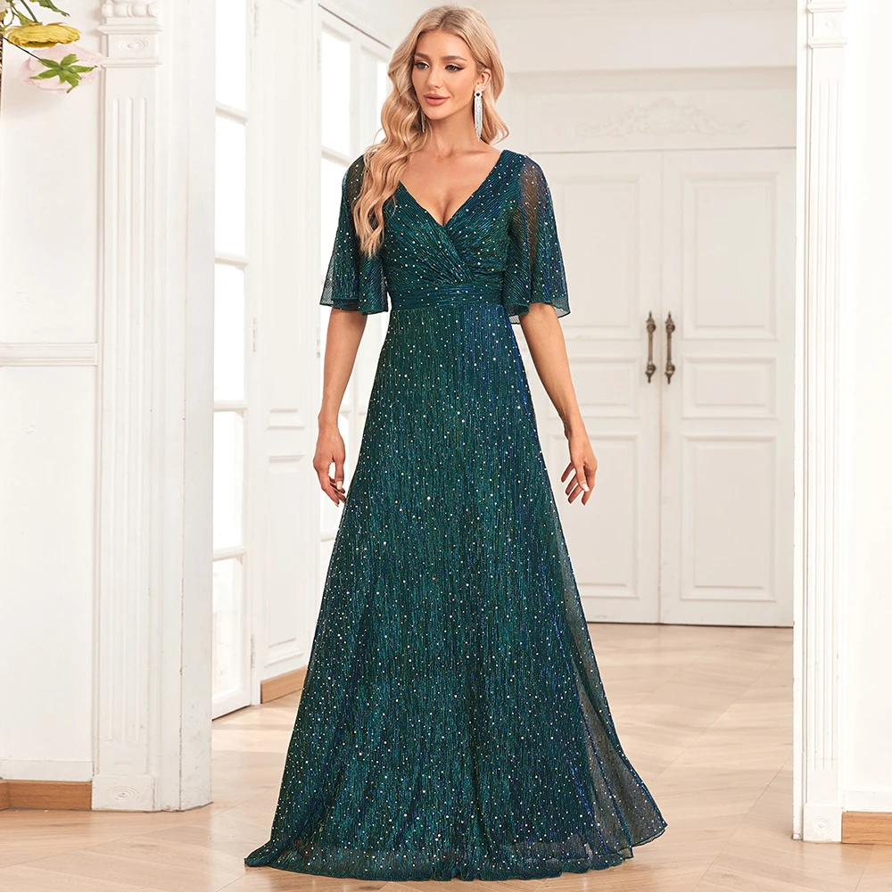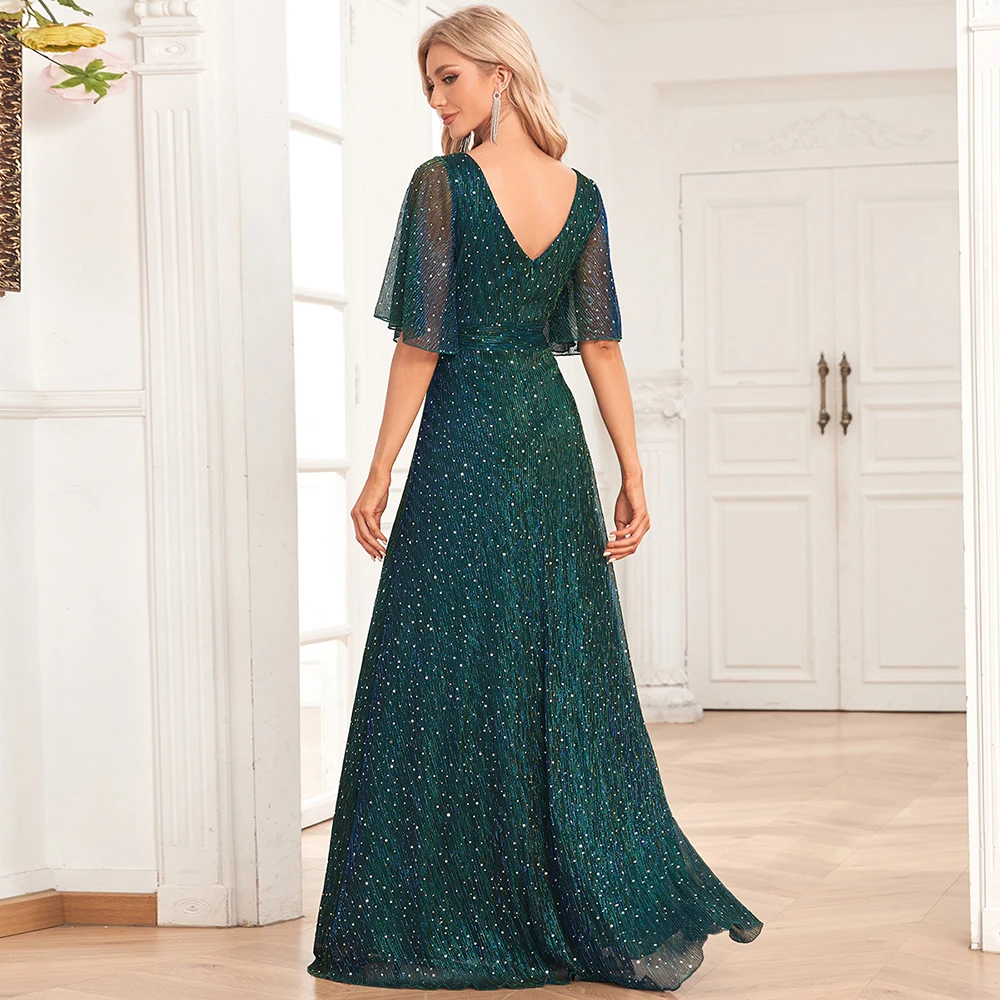 New York’s Fashion 2023 New Sparkling Butterfly Sleeve Evening Gowns Double V-Neck A-line Wedding Party Dress Sequin Floor Length Dress