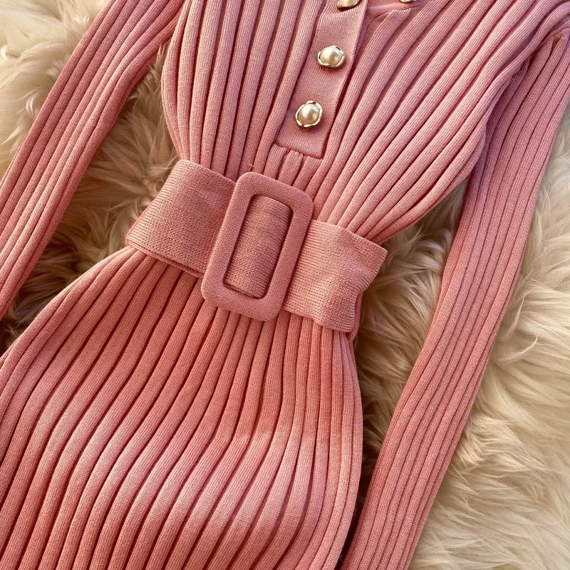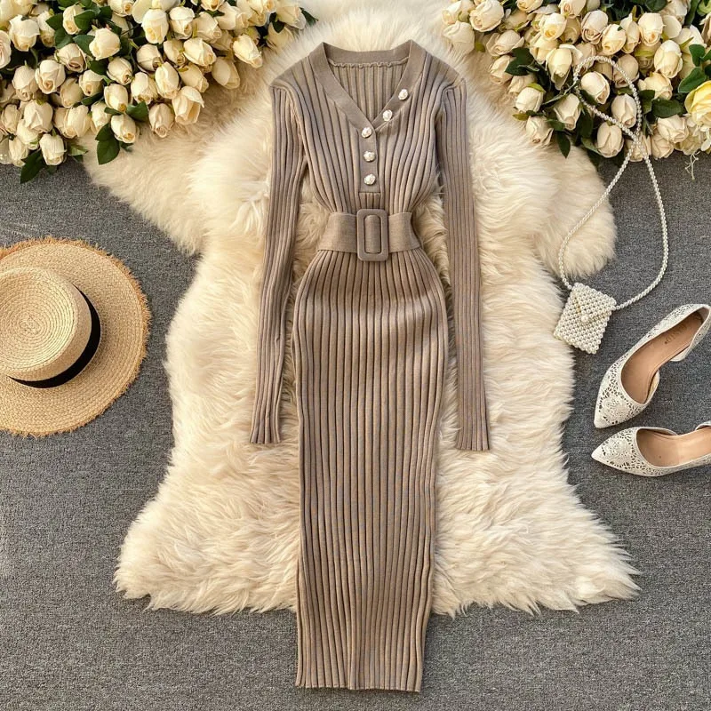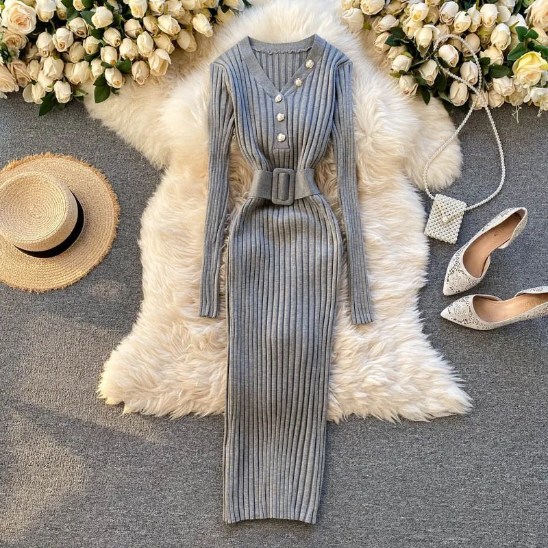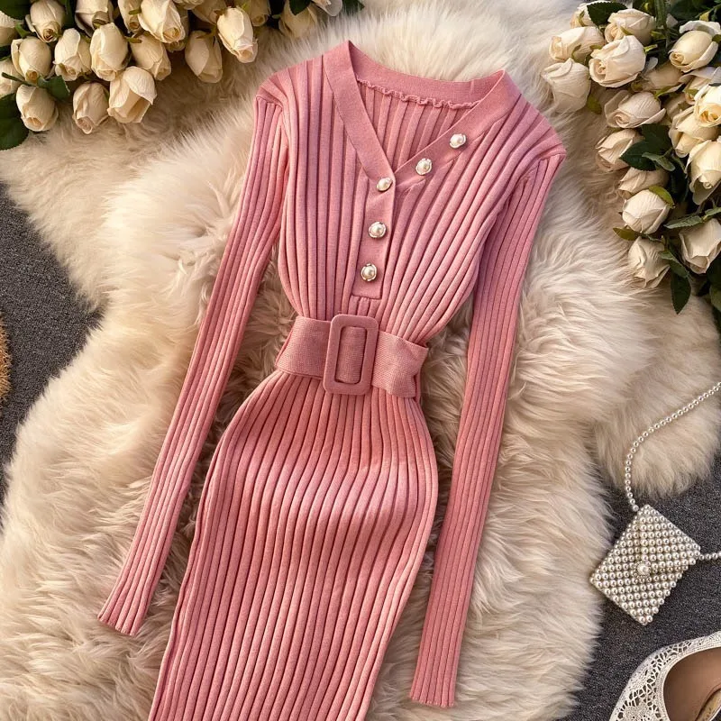 New York’s Fashion 2024 Autumn Winter V-neck Knitted Sweater Dress with Belt Chic Fashion Slim Elastic Ribbed Bodycon Dress Lady Vestidos