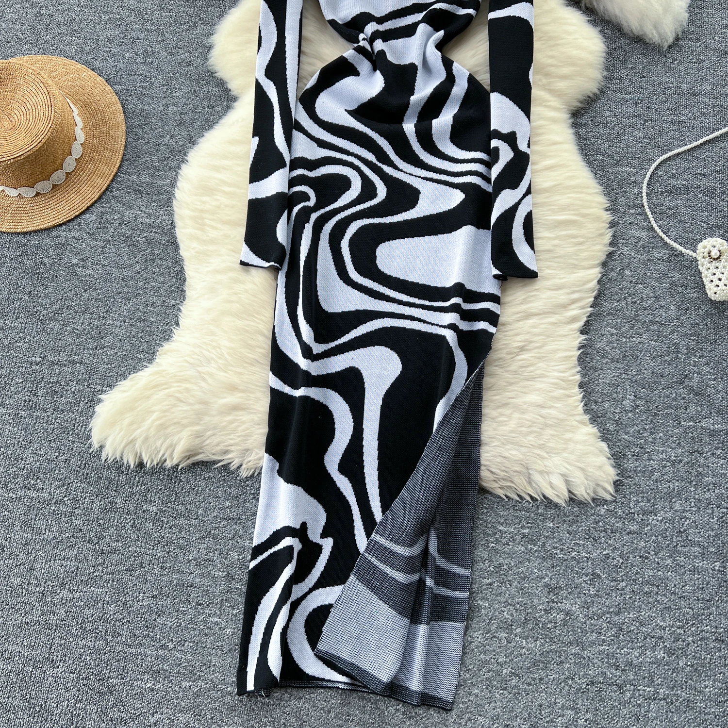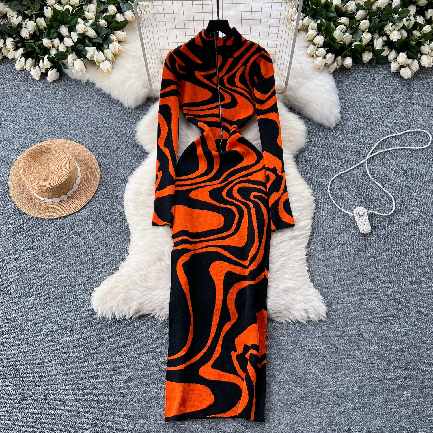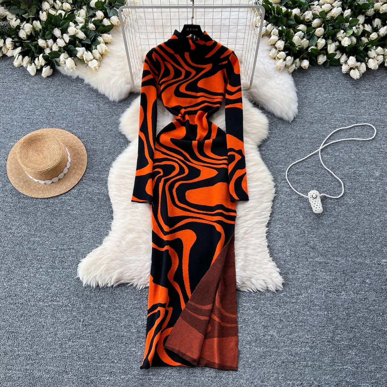 New York’s Fashion American Evening Party Dress 2024 Newest Ladies Turtleneck Zipper Print Bodycon Split Fashion Knitting Long Dresses