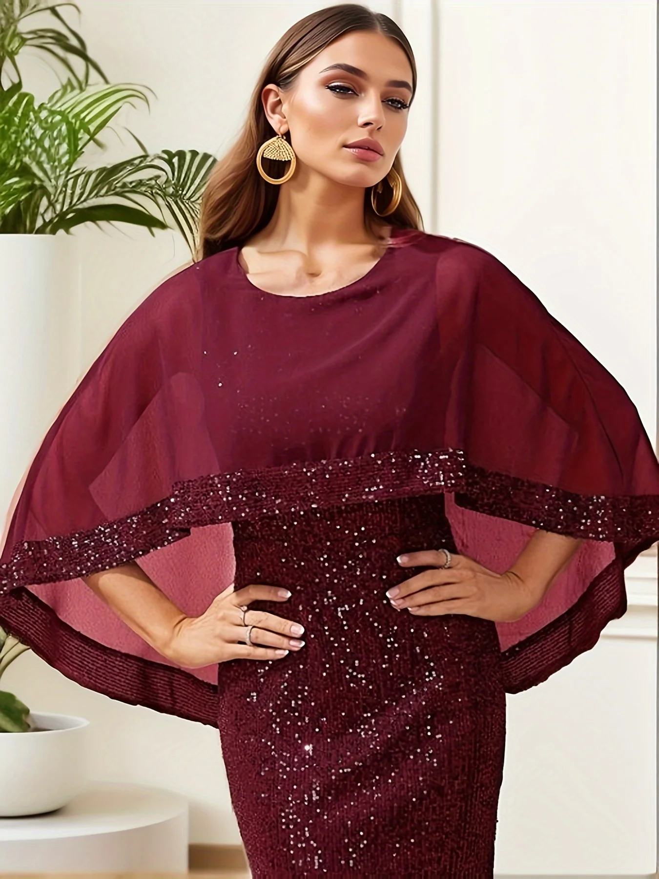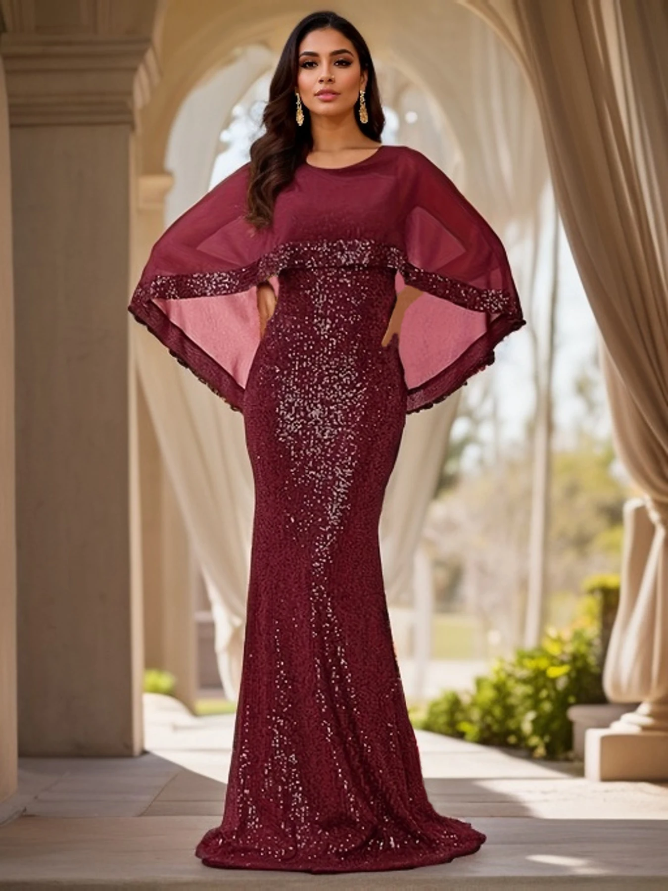 New York’s Fashion Arabic Women Evening Party Dress O Neck Cape Sleeve Sequin Stretchy Black Floor Length Formal Wedding Dresses Prom Gown 2025