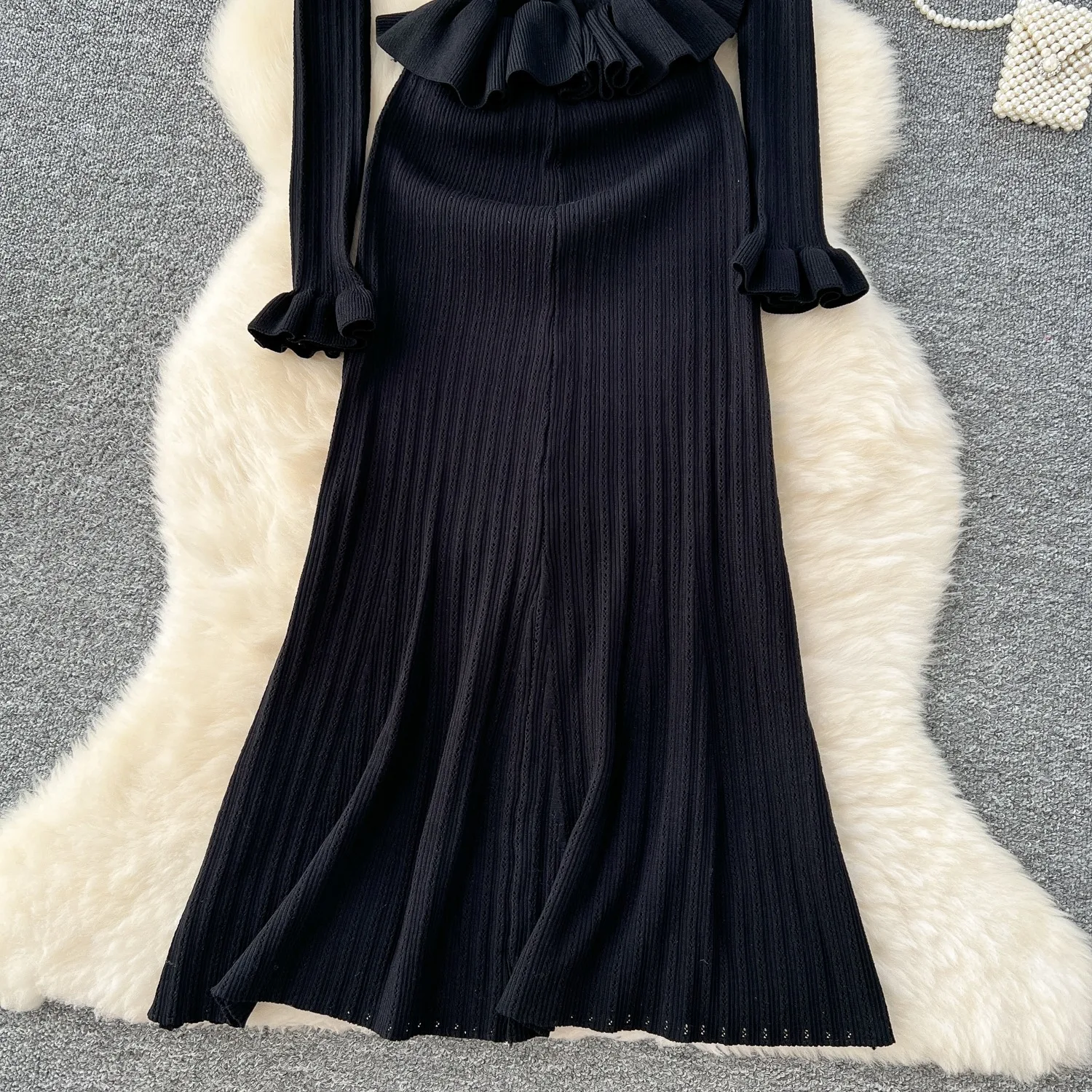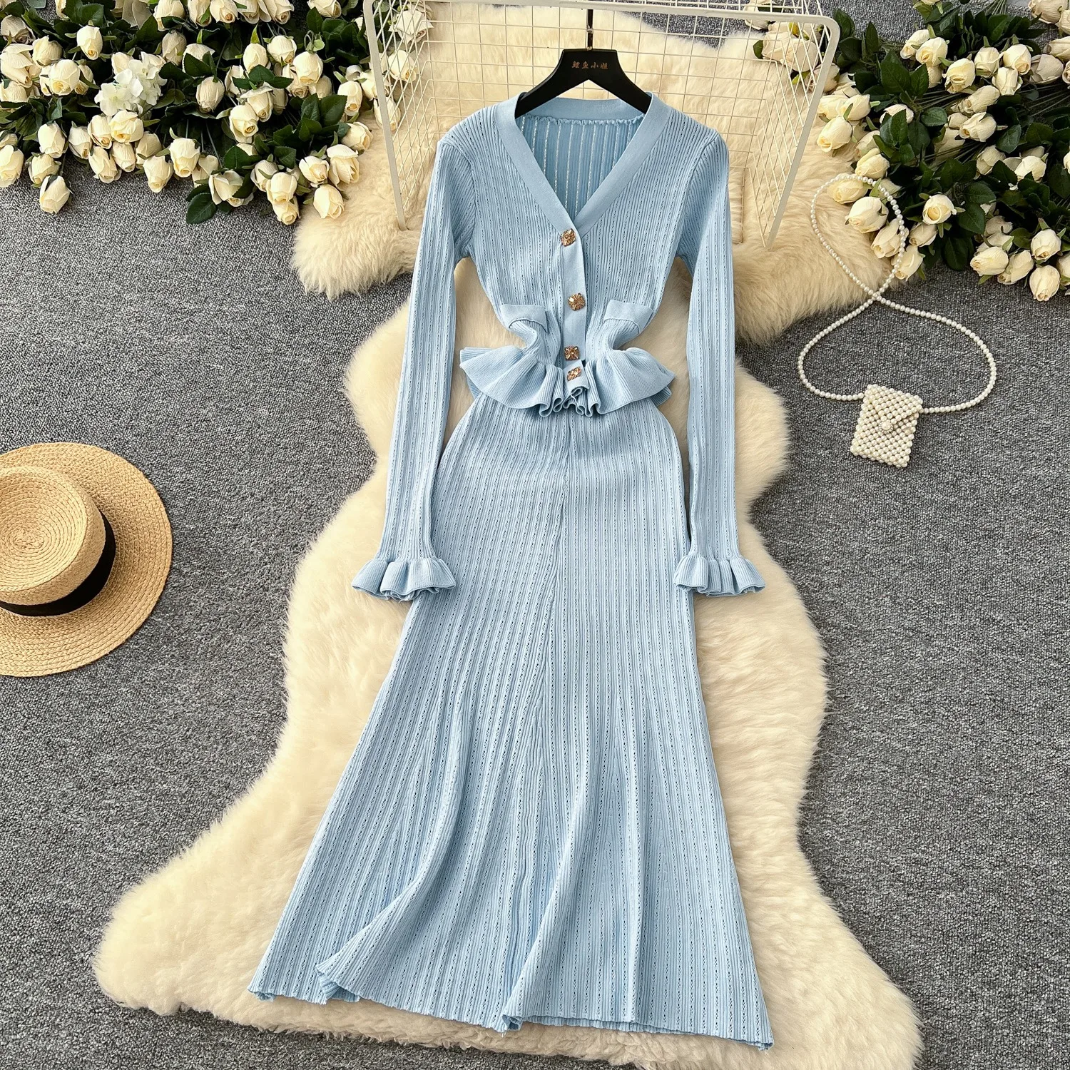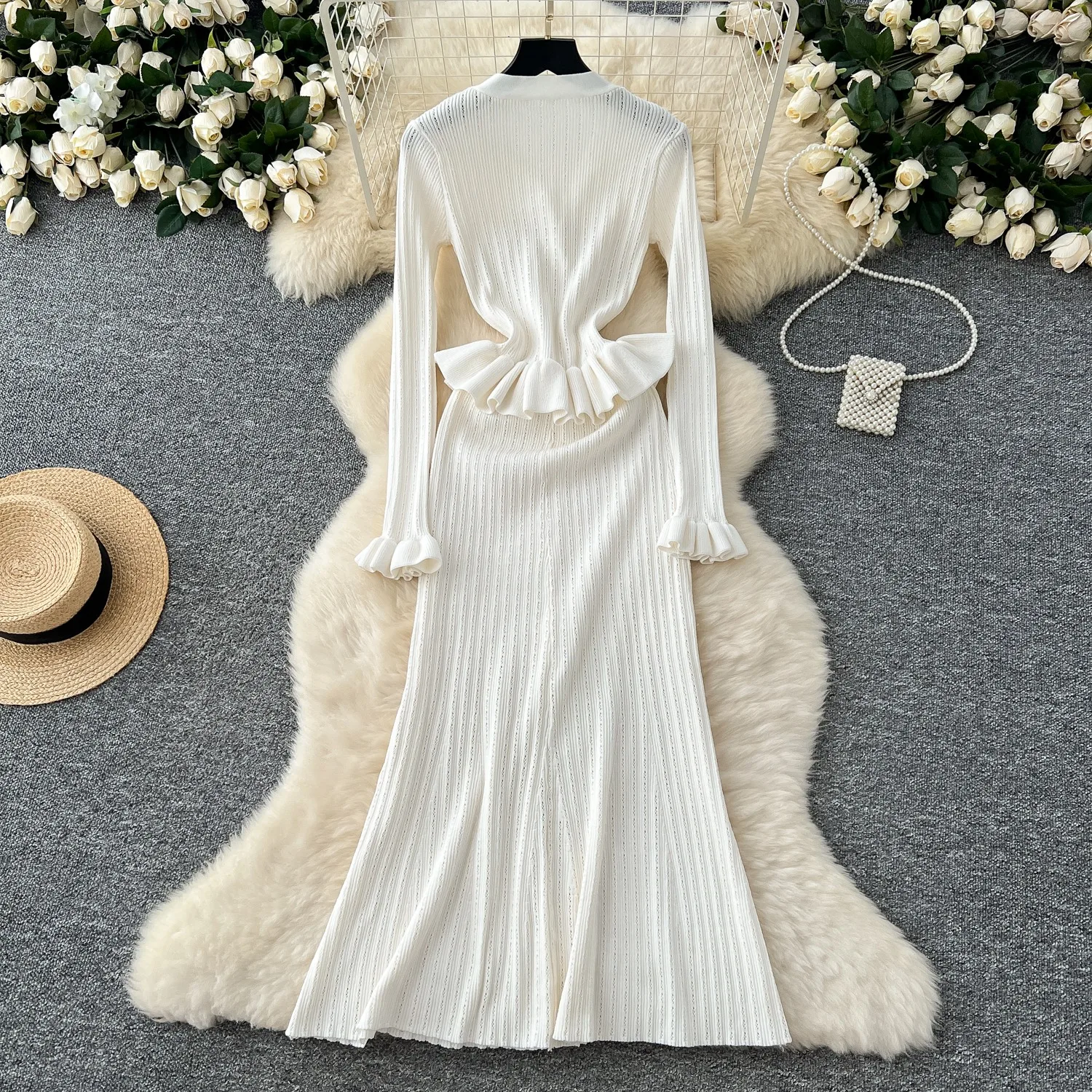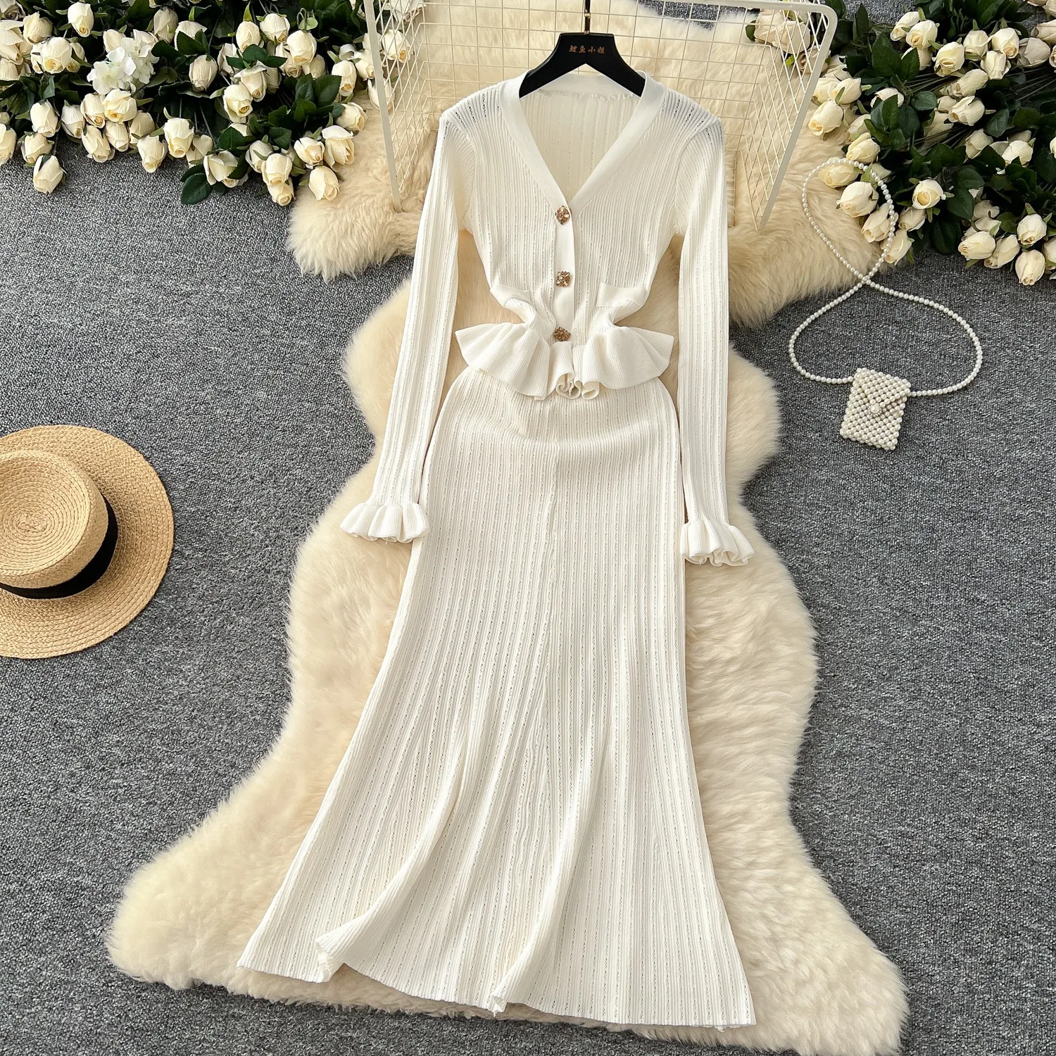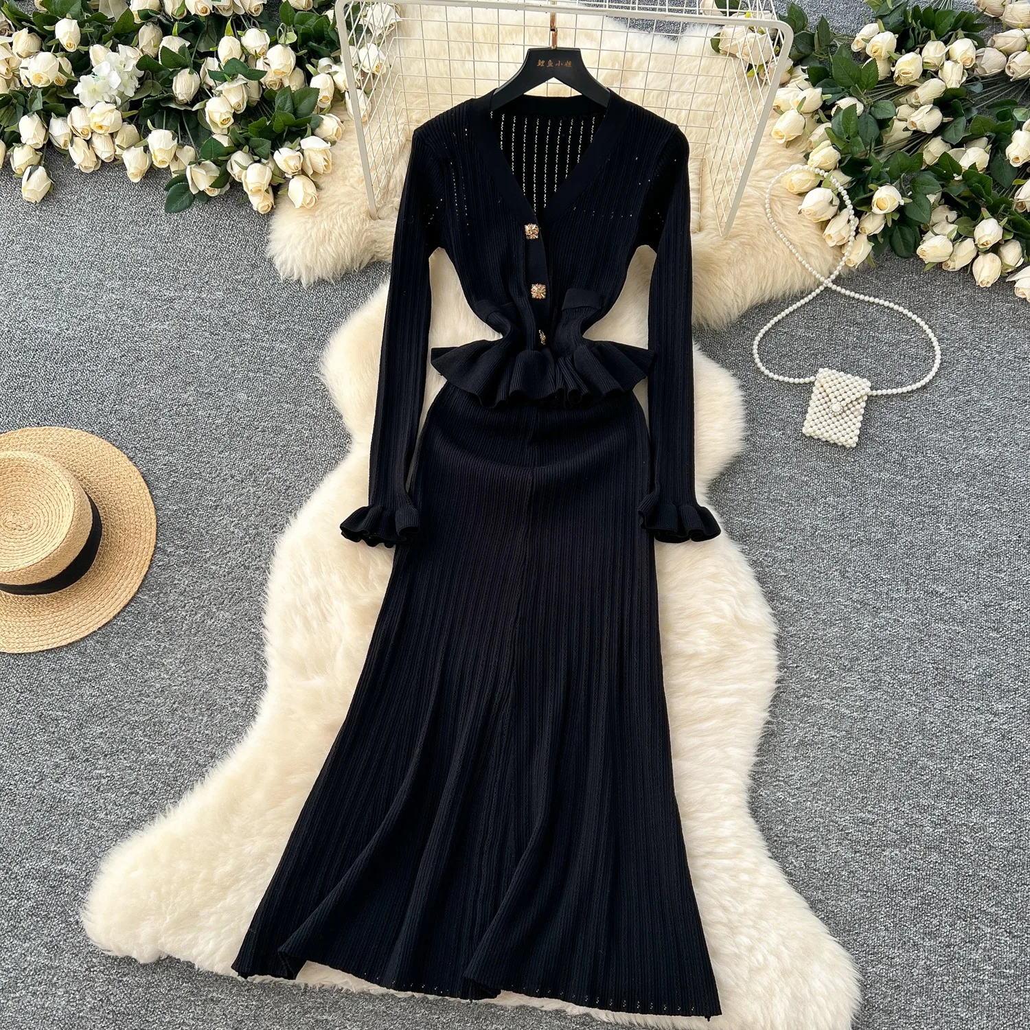 New York’s Fashion Brand Fashion One Piece Maxi Dress 2025 Woman Luxury V-neck Rhinestone Slim Waist Ruffled Knitted Dress Party Vestidos
