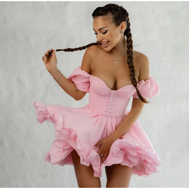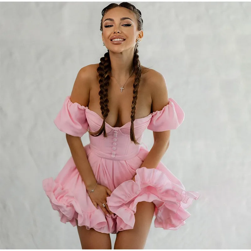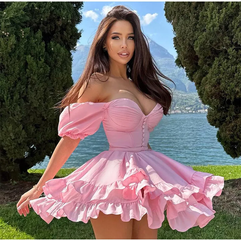 New York’s Fashion Chic Pink Layer Ruffle Hem A-line Mini Dress Women Sexy Off Shoulder Puff Sleeves Corset Vestido 2024 Lady Party Evening Dresses