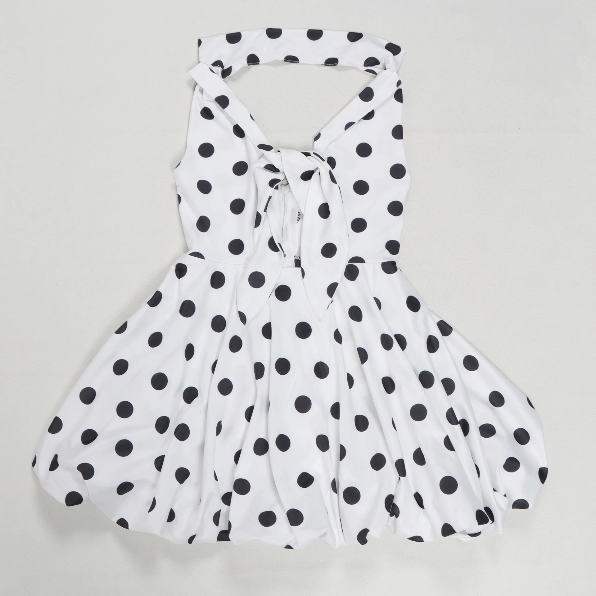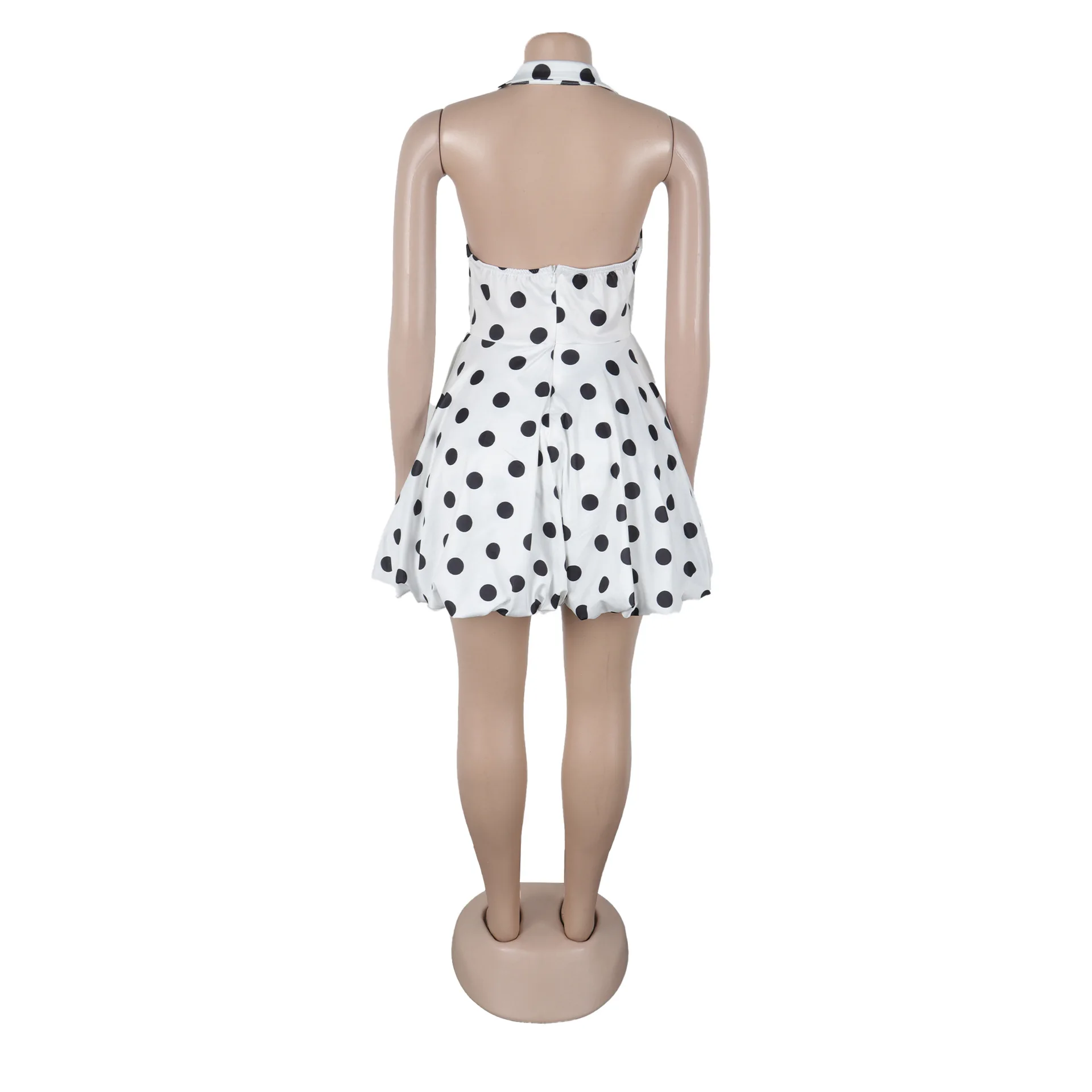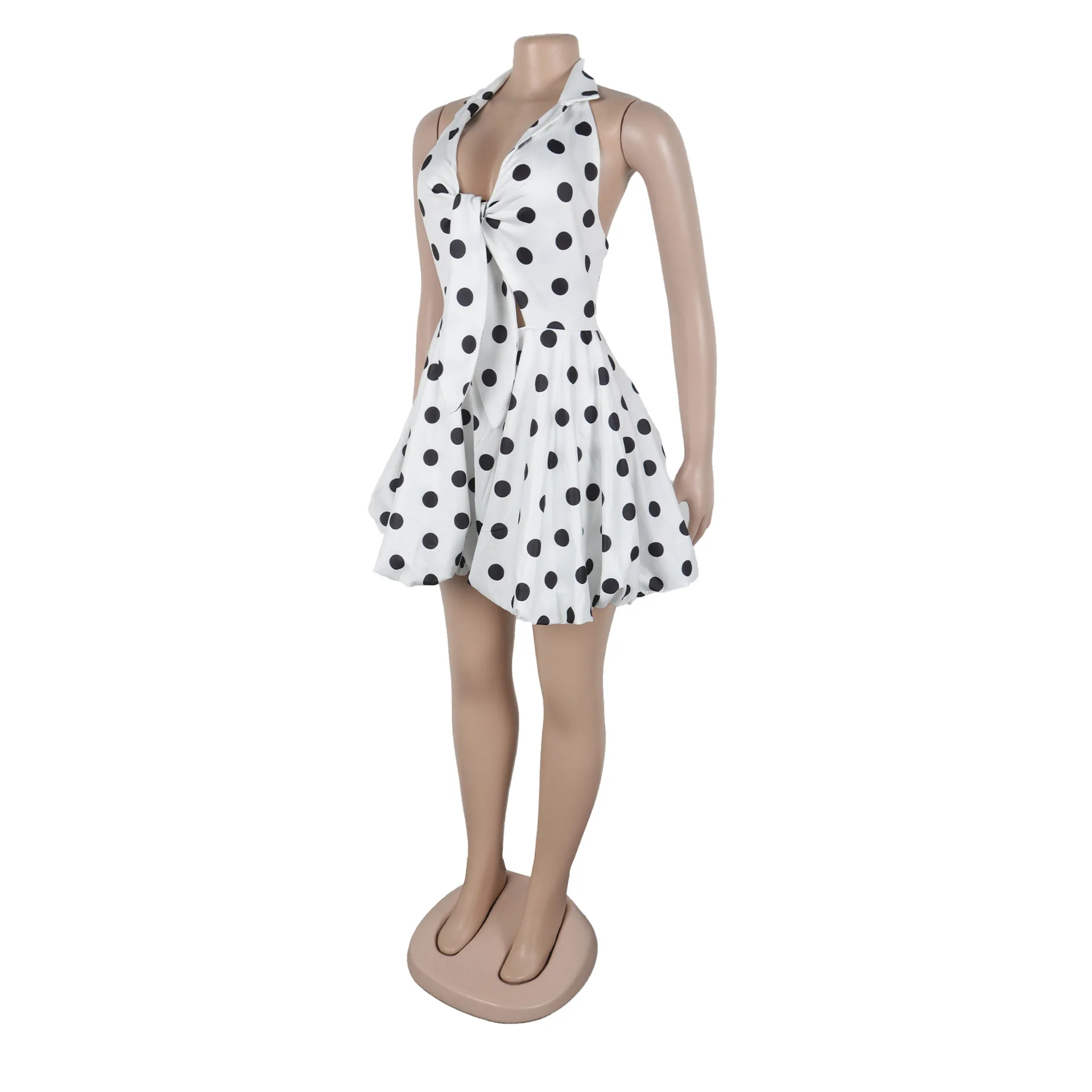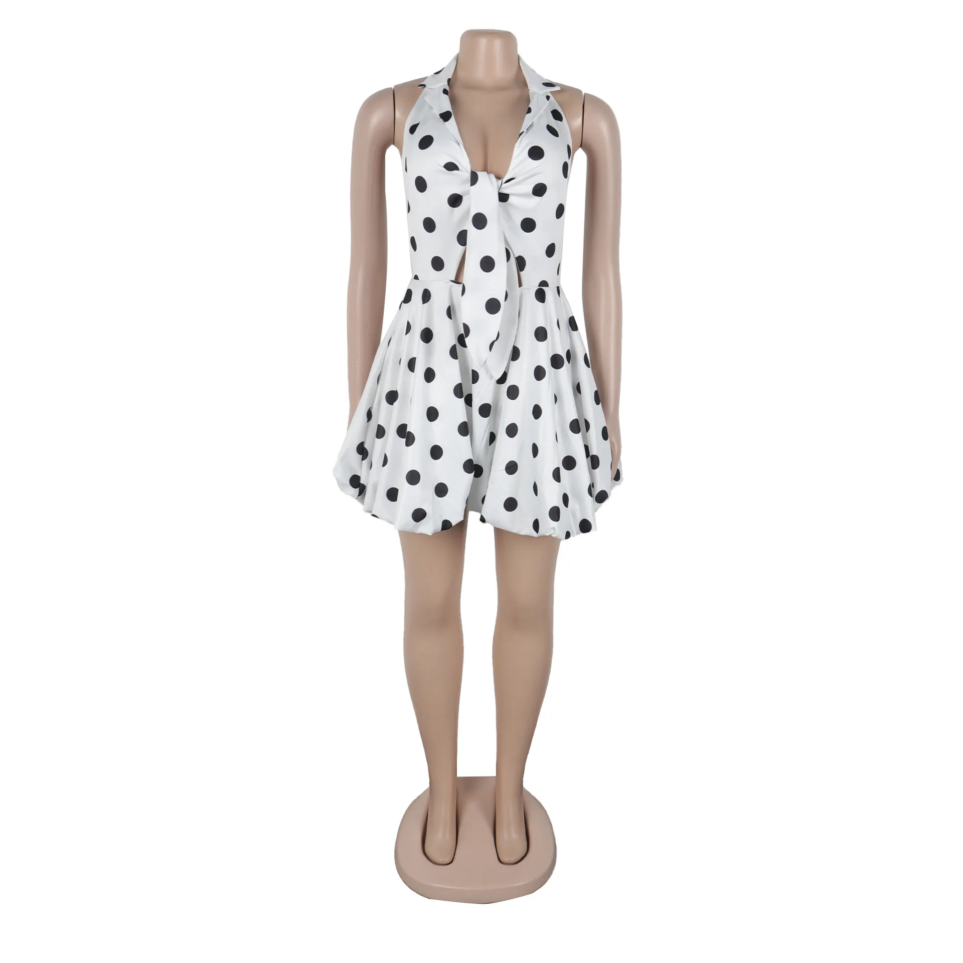 New York’s Fashion Elegant Polka Dot Print Dress with Tie Waist and Small Lapel Puff Skirt Design Inspired Halter Neck Dress for Women