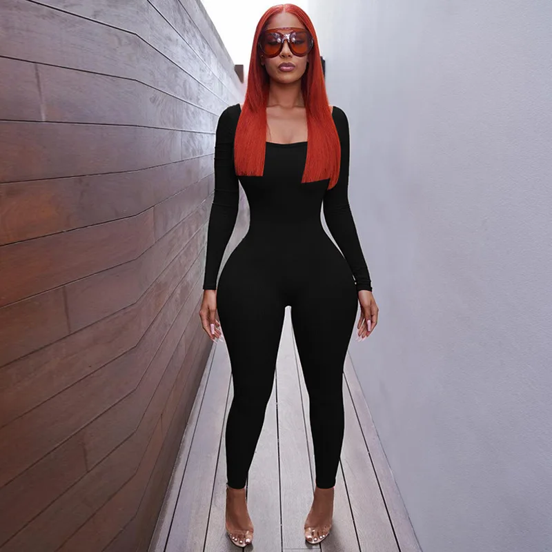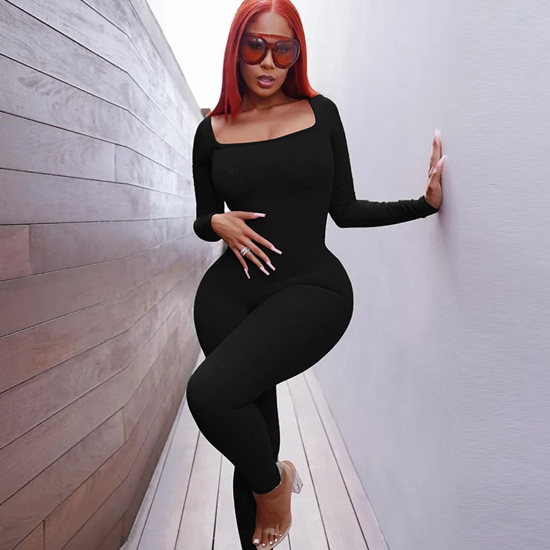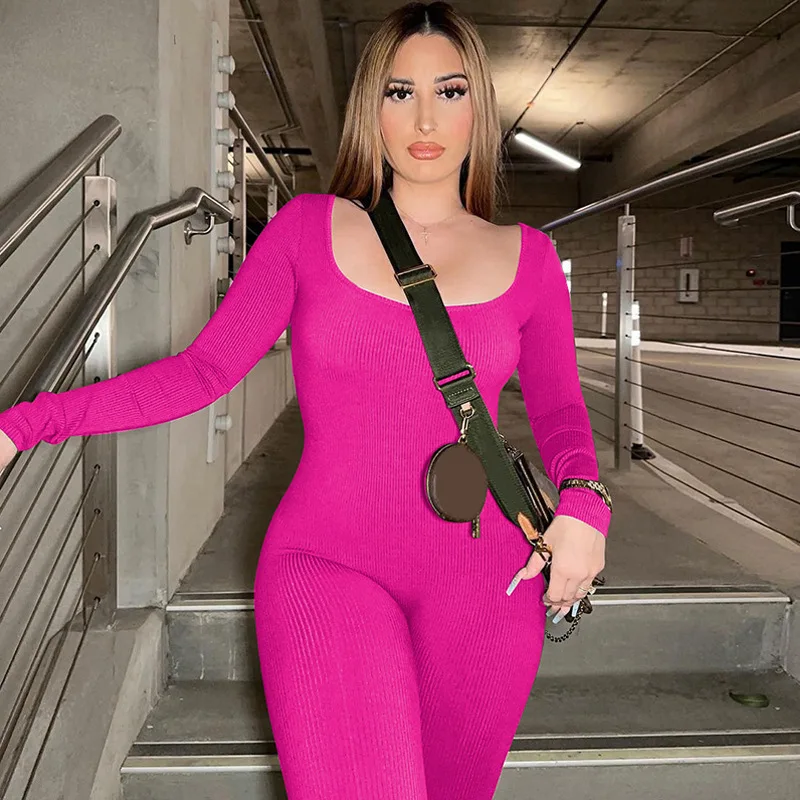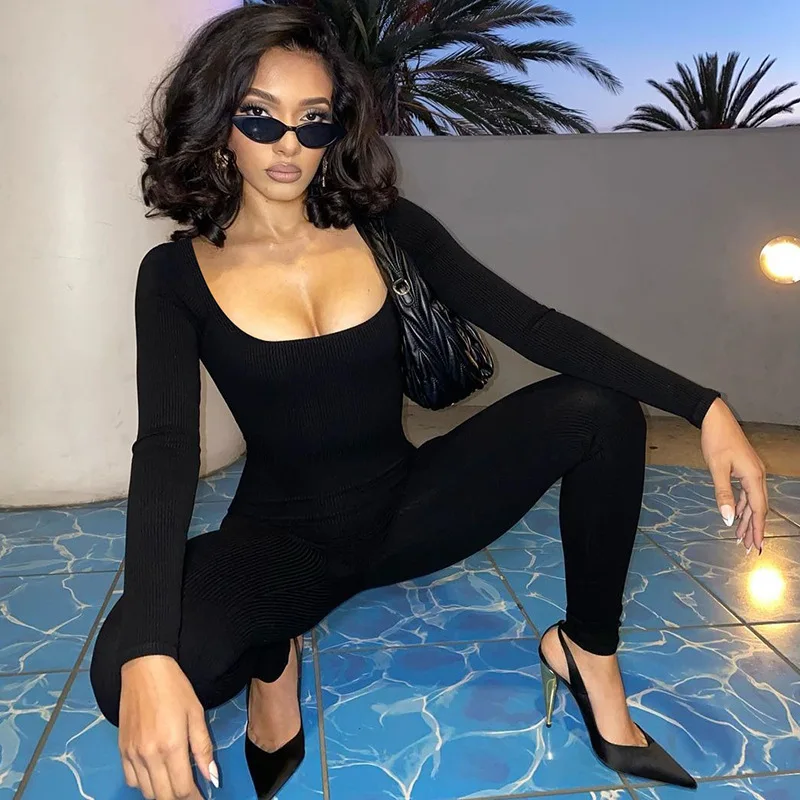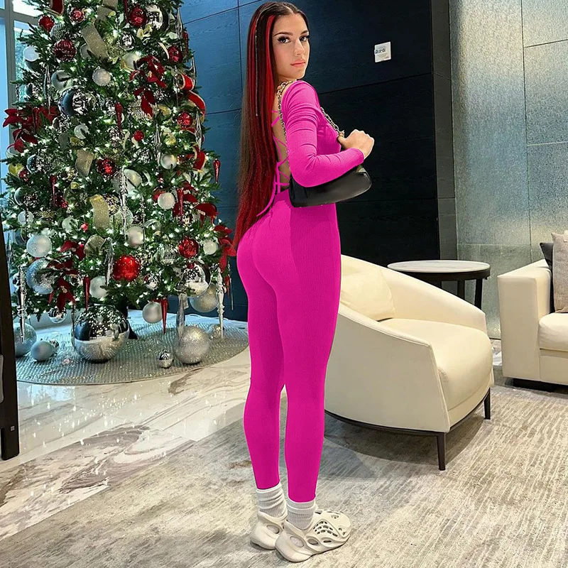 New Yorks Fashion Elegant Ribbed Backless Sexy Jumpsuits For Women Autumn Winter New U Neck Long Sleeve Fashion Club Party Jumpsuits