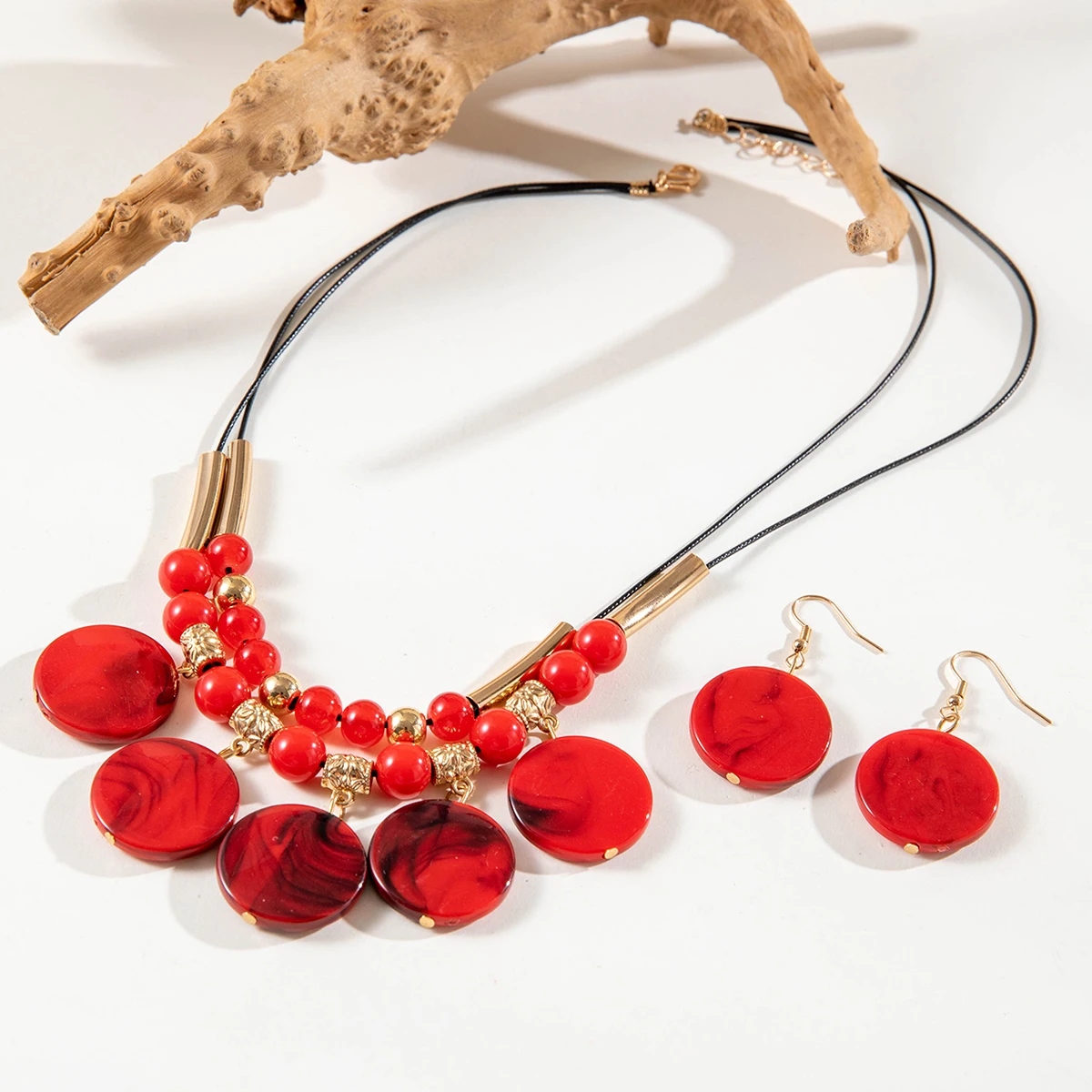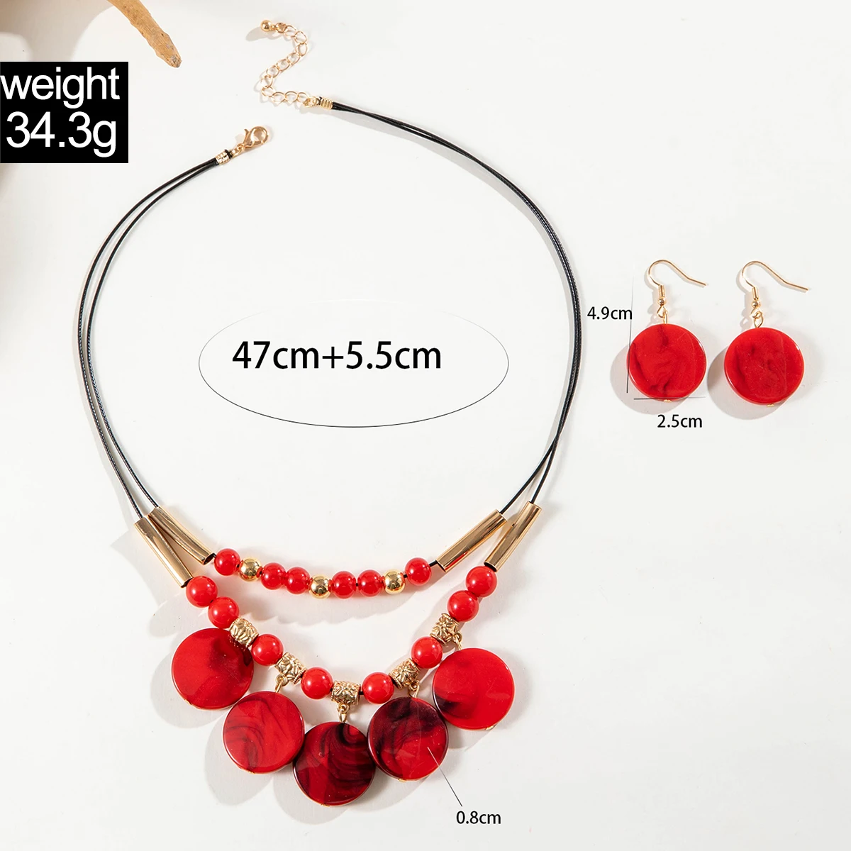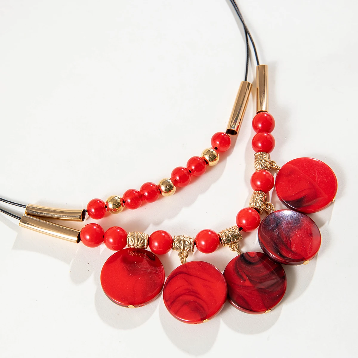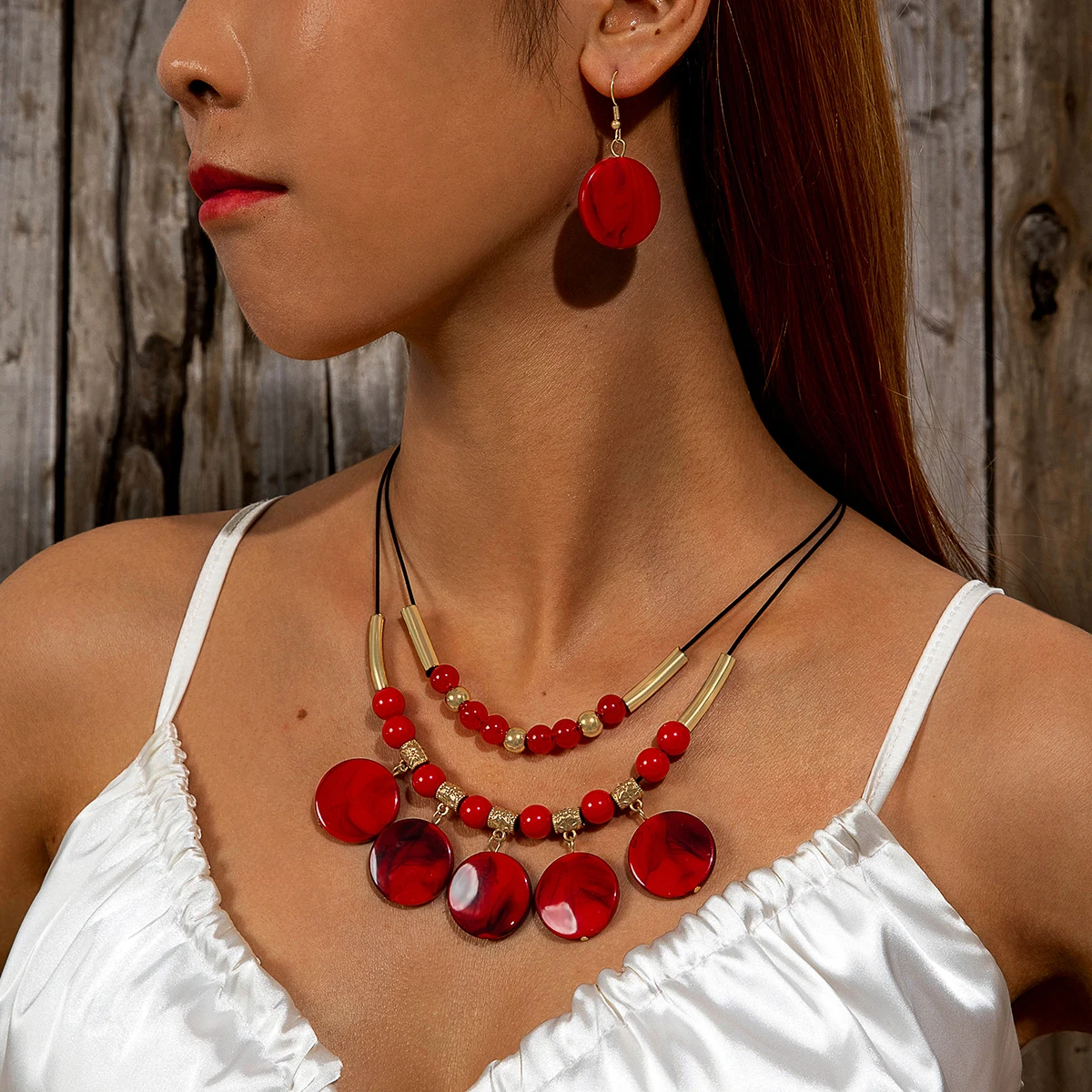 New York’s Fashion Elegant Tassel Bead Multi layer Necklace for Women Bohemian Red Stone Drop Earrings Jewelry Set Accessories Gift