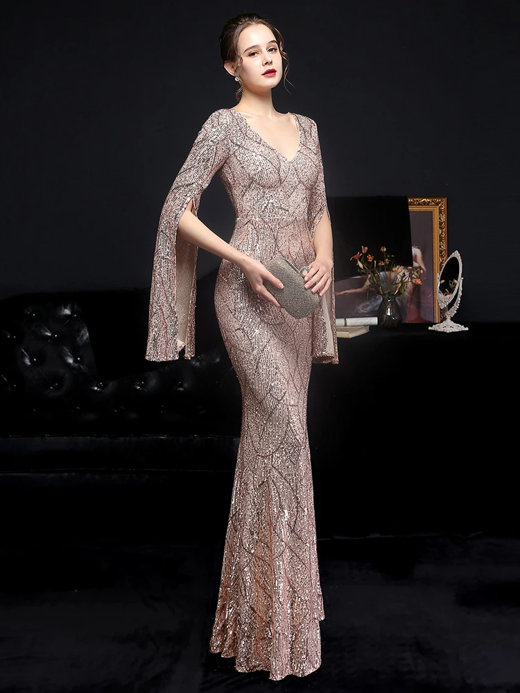 New yorks Fashion Gold Sequin Evening Dress Women Long Sleeve Dress Elegant Party Maxi Dress Long Prom Dress