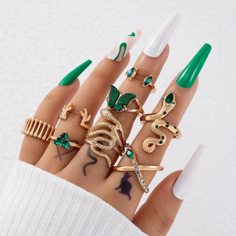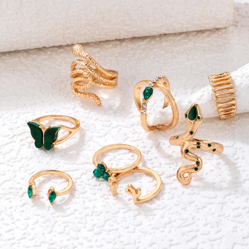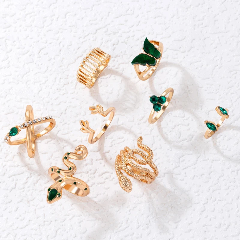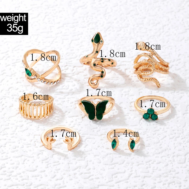 New York’s Fashion Luxury Green Crystal Stone Snake Joint Ring Sets Pretty Butterfly Geomtry Open Ring Jewelry for Women 8pcs/sets