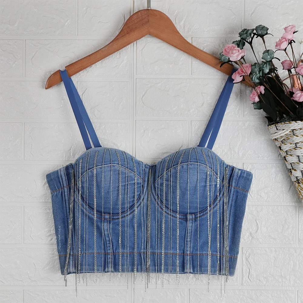 New York’s Fashion Sexy halter denim Rhinestone corset crop top women summer Vintage clothes bustier tank top rave outfit party club womens tops
