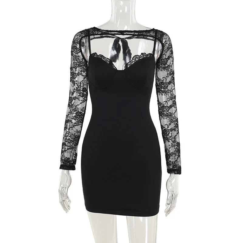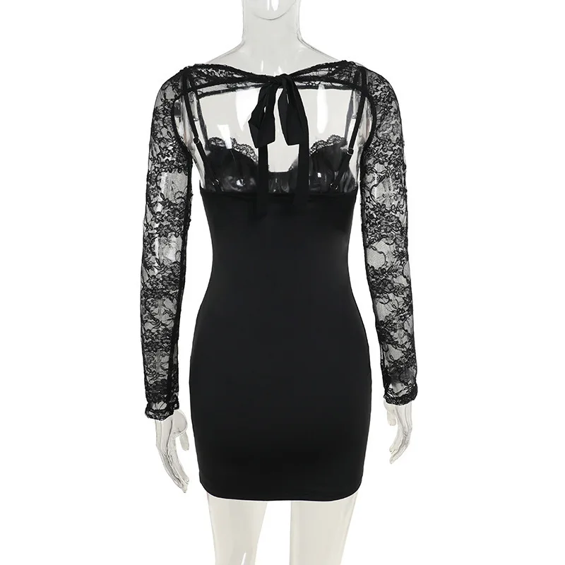 New York’s Fashion Sexy Lace V-neck Long Sleeve Hollow Out Mini Dress For Women Slim Fit Solid Lace Up Club Party Dress Bodycon Autumn
