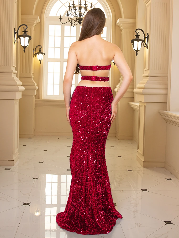 New York’s Fashion Sparkles Stretch Sequin Strapless Floor Length Party Dress Padded Backless Split Evening Night Sleeveless Dress