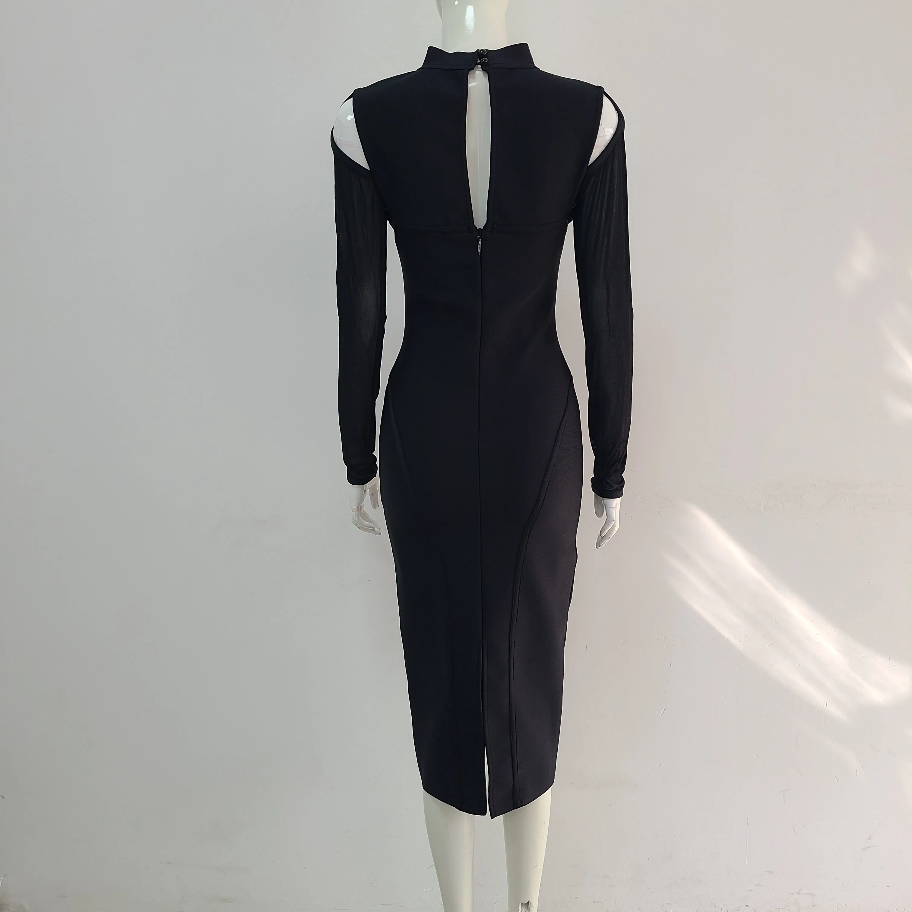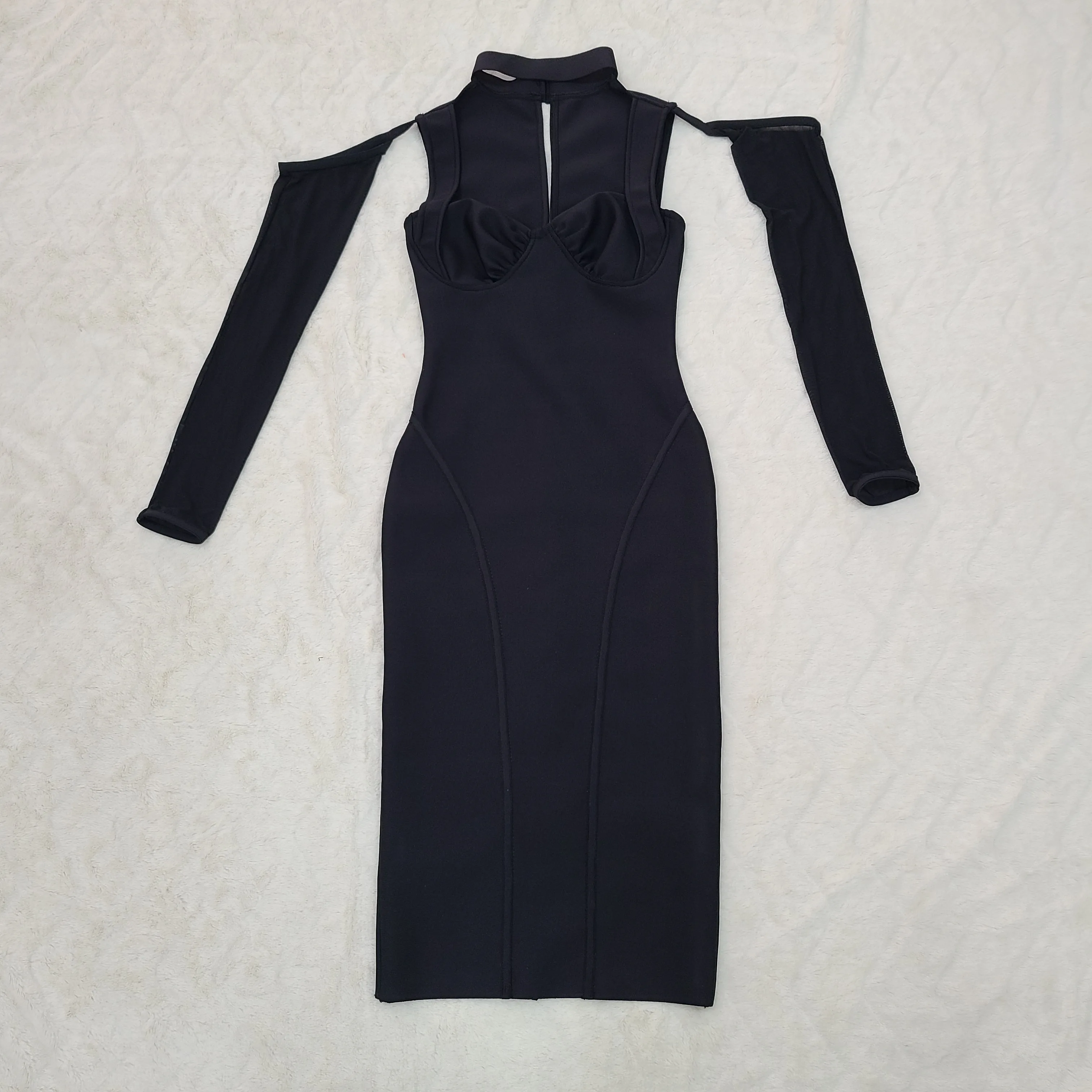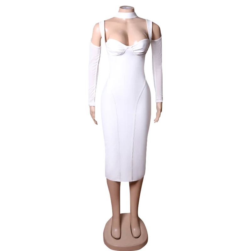 New York’s Fashion White Color Women Fashion Sexy Mesh Long Sleeve Mid-calf Bodycon Dress Rayon Bandage New Desinger Evening Party Dress