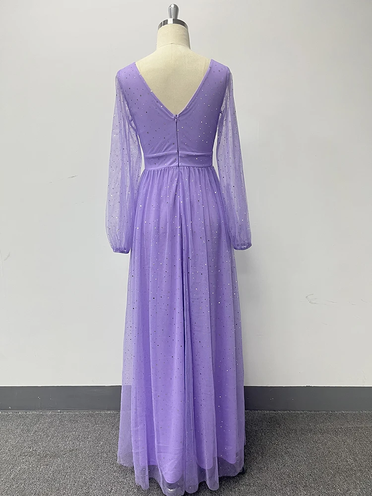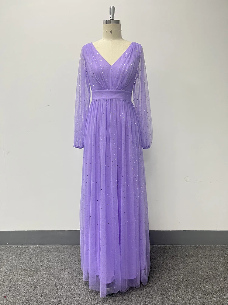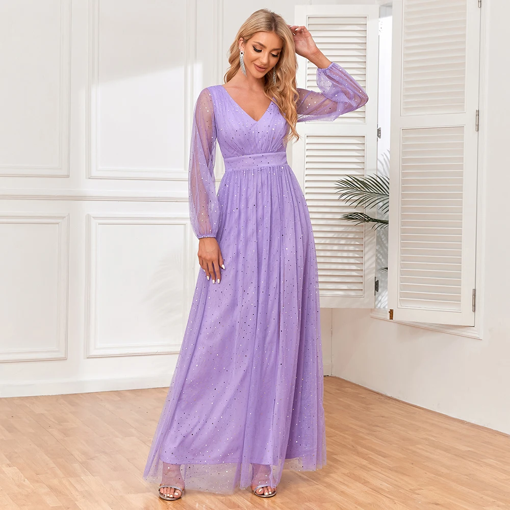 New York’s Fashion Women’s Elegant Double V-neck Perspective Long Sleeve Tulle Shiny Evening Dress A-line Large Swing Fully Lined Wedding Bridesmai