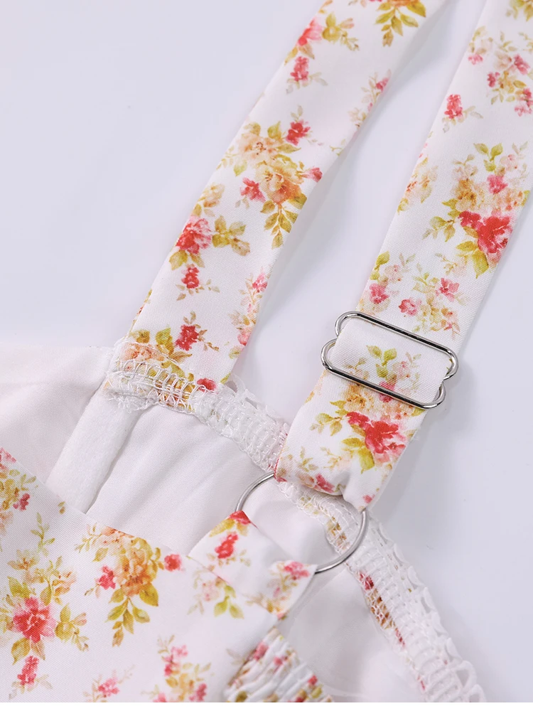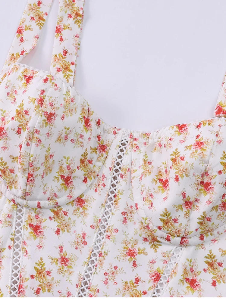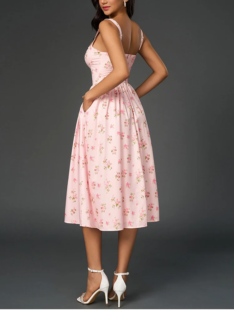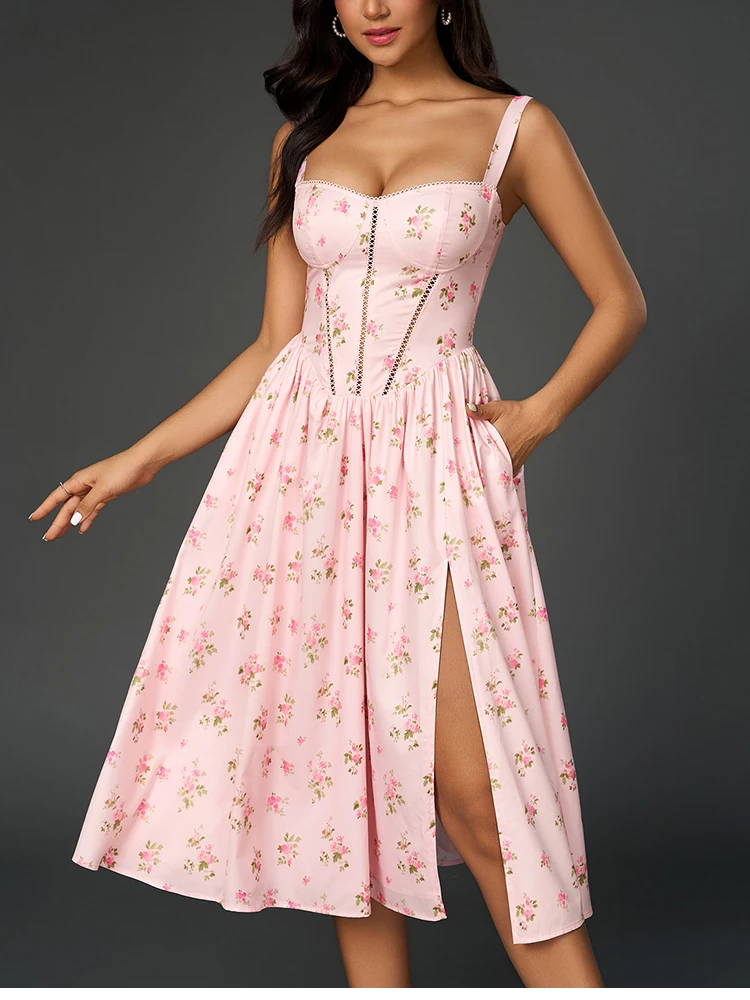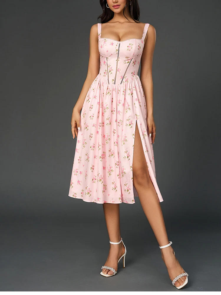 New York’s Fashion Women’s Floral Print Strap A-Line Sexy High Slit Midi Dress Backless Delicate Cutouts Summer Party Beach Holiday Dress