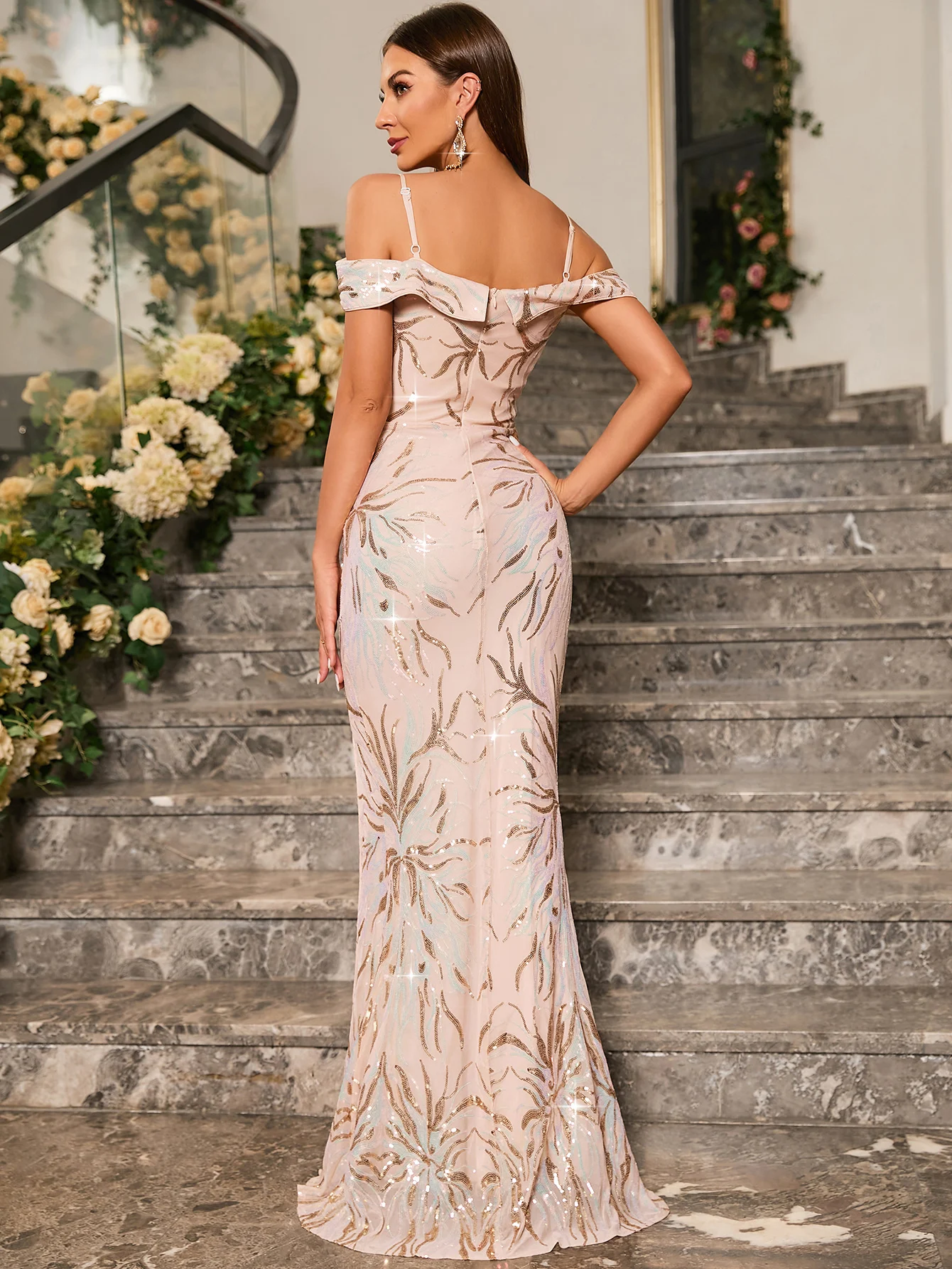 New York’s Fashion Women’s Random Cut Spaghetti Straps Deep-Neck High Slit Sequin Formal Party Dress