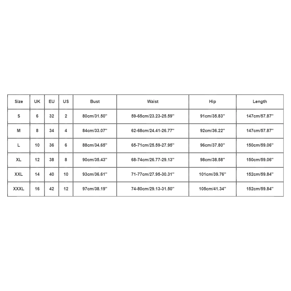 | Size:XXL | UK:14 | EU:40 | US:10 | Bust:93cm/36.61” | Waist:71-77cm/27.95-30.31” | Hip:101cm/39.76” | Length:152cm/59.84” |